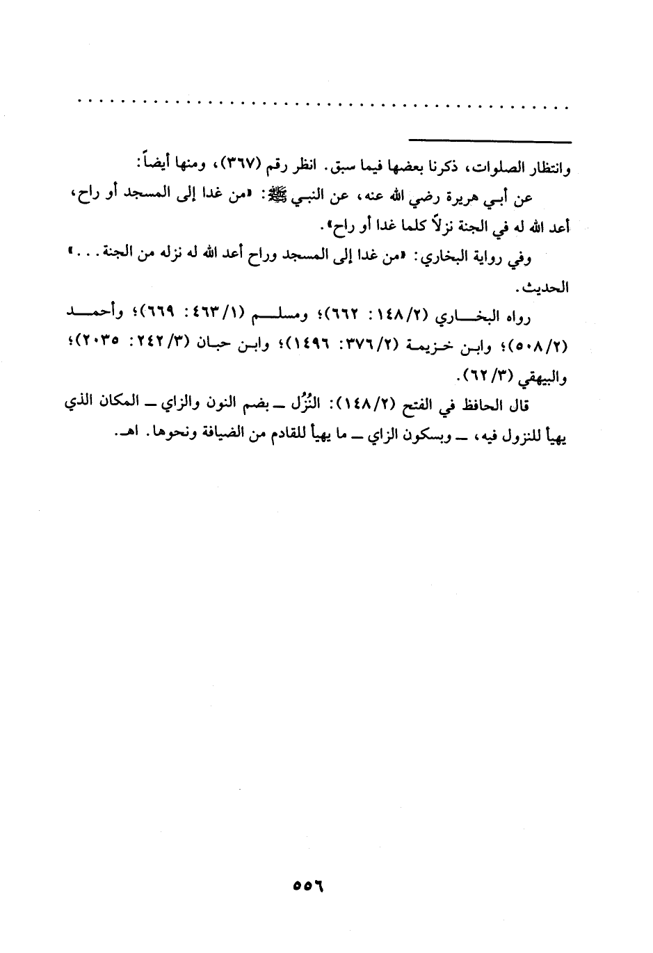 عَنْ أَبِي هُرَيْرَةَ رَضِيَ اللَّهُ عَنْهُ، عَنِ النبي -صلى الله عليه وسلم-: "من غدا إلى المسجد أو راح، أعد الله له في الجنة نزلًا كلما غدا أو راح".