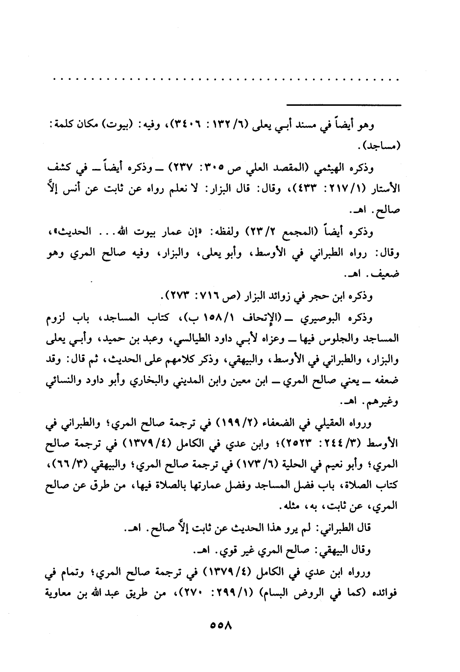 وذكره البوصيري - (الإتحاف 1/ 158 ب)، كتاب المساجد، باب لزوم المساجد والجلوس فيها- وعزاه لأبي داود الطيالسي، وعبد بن حميد، وأبي يعلى والبزار، والطبراني في الأوسط، والبيهقي، وذكر كلامهم على الحديث، ثم قال: وقد ضعفه -يعني صالح المري- ابن معين وابن المديني والبخاري وأبو داود والنسائي وغيرهم. اهـ.