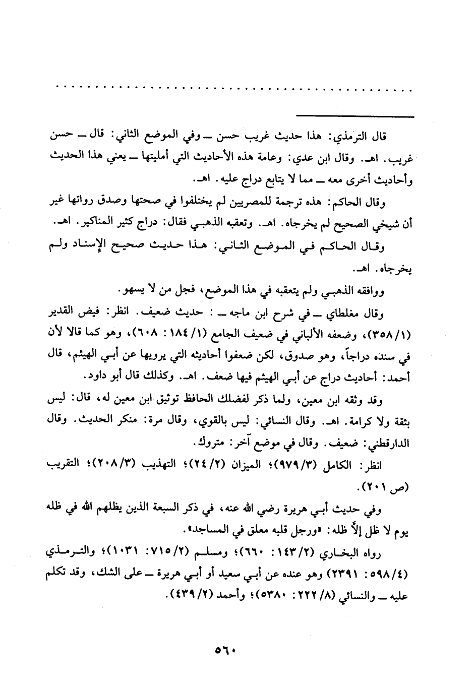 وقال مغلطاي -في شرح ابن ماجه-: حديث ضعيف. انظر: فيض القدير (1/ 358)، وضعفه الألباني في ضعيف الجامع (1/ 184: 608)، وهو كما قالا لأن في سنده دراجًا، وهو صدوق، لكن ضعفوا أحاديثه التي يرويها عن أبي الهيثم، قال أحمد: أحاديث دراج عن أبي الهيثم فيها ضعف. اهـ. وكذلك قال أبو داود.