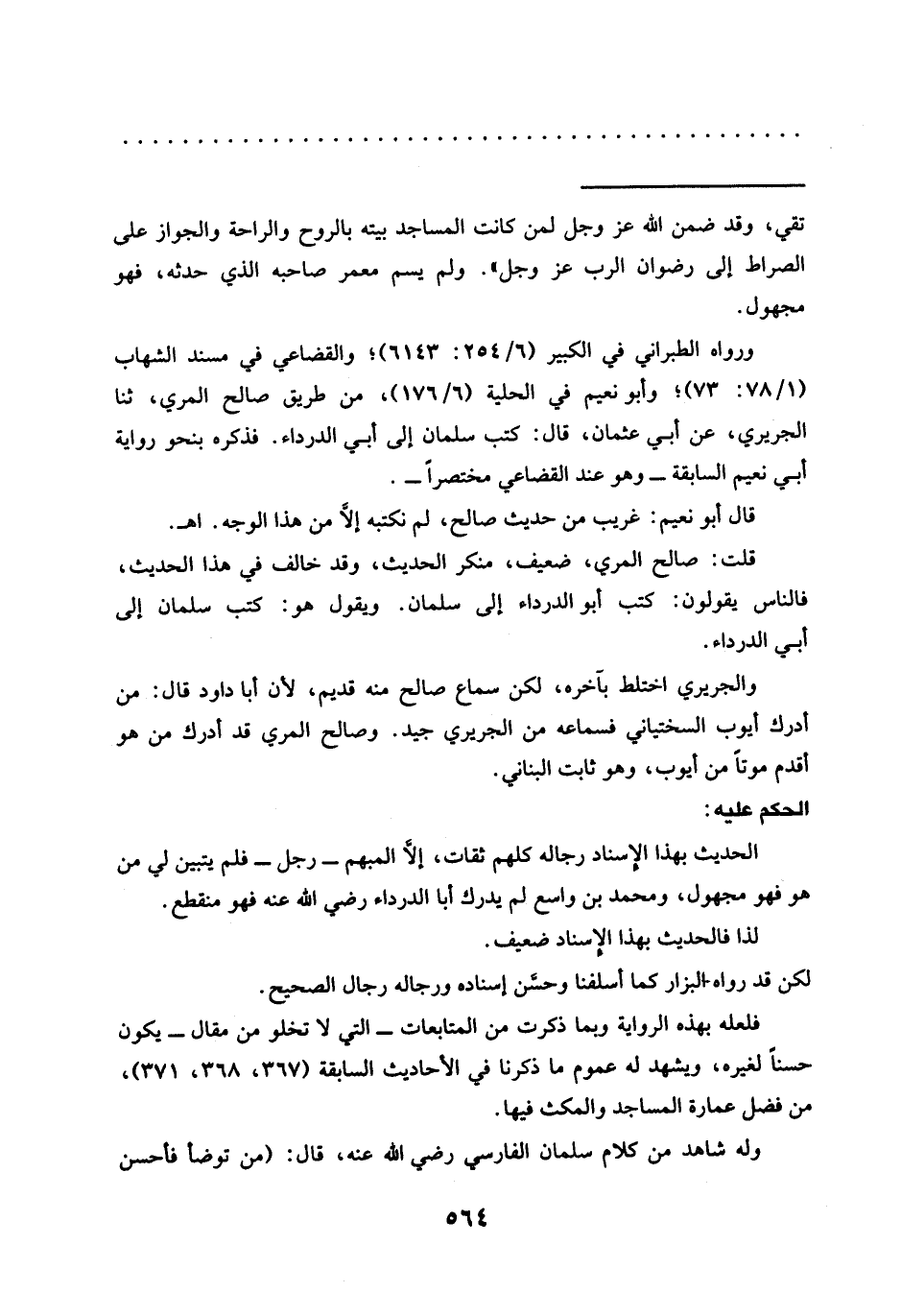 فلعله بهذه الرواية وبما ذكرت من المتابعات -التي لا تخلو من مقال- يكون حسنًا لغيره، ويشهد له عموم ما ذكرنا في الأحاديث السابقة (367، 368، 371)، من فضل عمارة المساجد والمكث فيها.