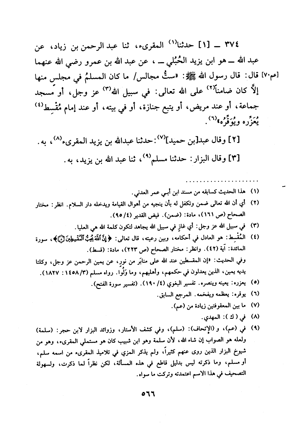 374 -[1] حَدَّثَنَا الْمُقْرِئُ ثنا عَبْدُ الرَّحْمَنِ بْنُ زِيَادٍ عَنْ عَبْدِ اللَّهِ هُوَ ابْنُ يَزِيدَ الْحُبُلِيُّ عَنْ عَبْدِ اللَّهِ بْنِ عَمْرٍو رَضِيَ اللَّهُ عَنْهُما قَالَ قَالَ رَسُولُ اللَّهِ صَلَّى اللَّهُ عَلَيْهِ وَسَلَّمَ " §سِتُّ مَجَالِسَ مَا كَانَ الْمُسْلِمُ فِي مَجْلِسٍ مِنْهَا إِلَّا كَانَ ضَامِنًا عَلَى اللَّهِ تَعَالَى فِي سَبِيلِ اللَّهِ عز وجل أَوْ مَسْجِدِ جَمَاعَةٍ أَوْ عِنْدَ مَرِيضٍ أَوْ يَتْبَعُ جَنَازَةً أَوْ فِي بَيْتِهِ أَوْ عِنْدَ إِمَامٍ مُقْسِطٍ يُعَزِّرُهُ وَيُوَقِّرُهُ