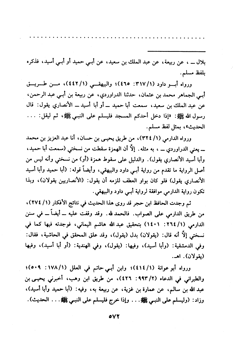 ورواه الدارمي (1/ 324)، من طريق يحيى بن حسان، أنا عبد العزيز بن محمد -يعني الدراوردي-، به مثله. إلَّا أن الهمزة سقطت من نسختي (سمعت أبا حمد، وأبا أسيد الأنصارى يقول). والدليل على سقوط همزة (أو) من نسختي وأنه ليس من أصل الرواية ما تقدم من رواية أبي داود والبيهقي، وأيضًا قوله: (أبا حميد وأبا أسيد الأنصارى يقول) فلو كان بواو العطف للزمه أن يقول: (الأنصاريين يقولان)، وبذا تكون رواية الدارمي موافقة لرواية أبي داود والبيهقي.