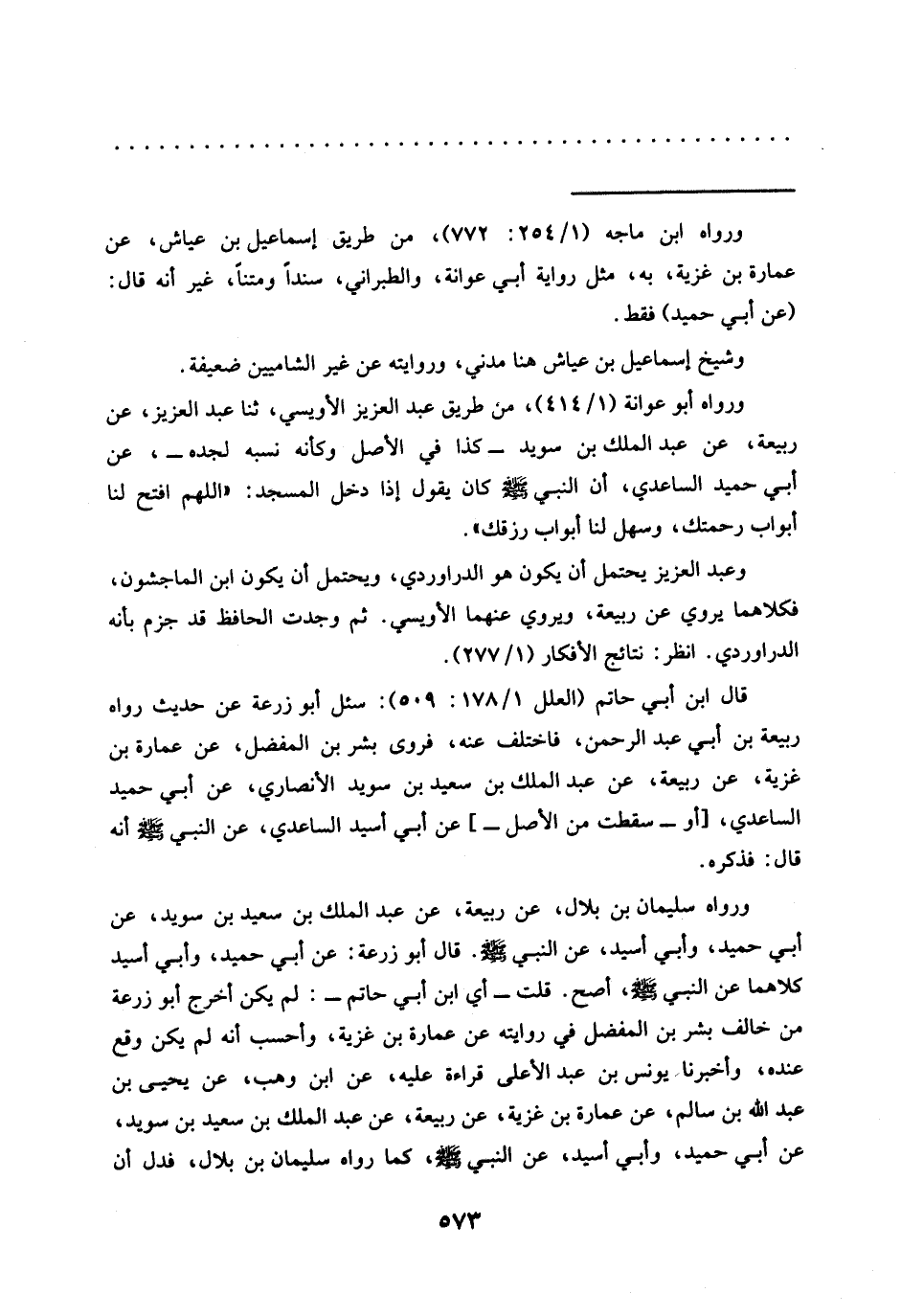 قال ابن أبي حاتم (العلل 1/ 178: 509): سئل أبو زرعة عن حديث رواه ربيعة بن أبي عبد الرحمن، فاختلف عنه، فروى بِشْرُ بْنُ الْمُفَضَّلِ، عَنْ عُمَارَةَ بْنِ غَزِيَّةَ، عن ربيعة، عن عبد الملك بن سعيد بن سويد الأنصاري، عن أبي حميد الساعدي، [أو -سقطت من الأصل-] عن أبي أسيد الساعدي، عَنِ النَّبِيِّ -صَلَّى اللَّهُ عَلَيْهِ وَسَلَّمَ- أَنَّهُ قال: فذكره.