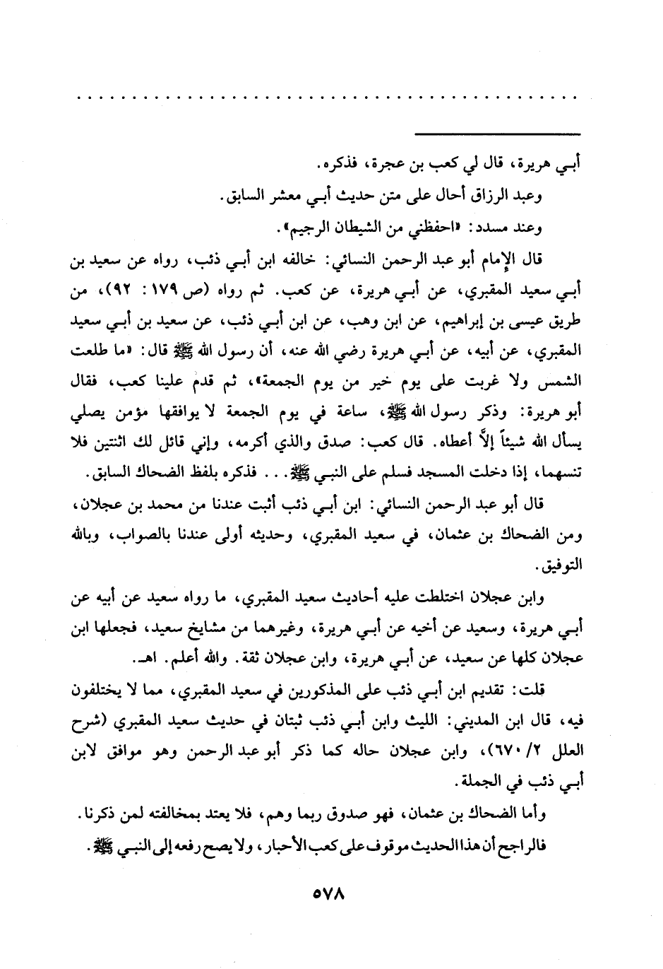 قال الإِمام أبو عبد الرحمن النسائي: خالفه ابن أبي ذئب، رواه عن سعيد بن أبي سعيد المقبري، عن أبي هريرة، عن كعب. ثم رواه (ص 179: 92)، من طريق عيسى بن إبراهيم، عن ابن وهب، عن ابن أبي ذئب، عن سعيد بن أبي سعيد المقبري، عن أبيه، عن أبي هريرة رضي الله عنه، أن رسول الله -صلى الله عليه وسلم- قال:"ما طلعت الشمس ولا غربت على يوم خير من يوم الجمعة"، ثم قدم علينا كعب، فقال أبو هريرة: وذكر رَسُولُ اللَّهِ -صَلَّى اللَّهُ عَلَيْهِ وَسَلَّمَ-، سَاعَةٌ في يوم الجمعة لا يوافقها مؤمن يصلي يسأل الله شيئًا إلَّا أعطاه. قال كعب: صدق والذي أكرمه، وإني قائل لك اثنتين فلا تنسهما، إذا دخلت المسجد فسلم على النبي -صلى الله عليه وسلم- ... فذكره بلفظ الضحاك السابق.
