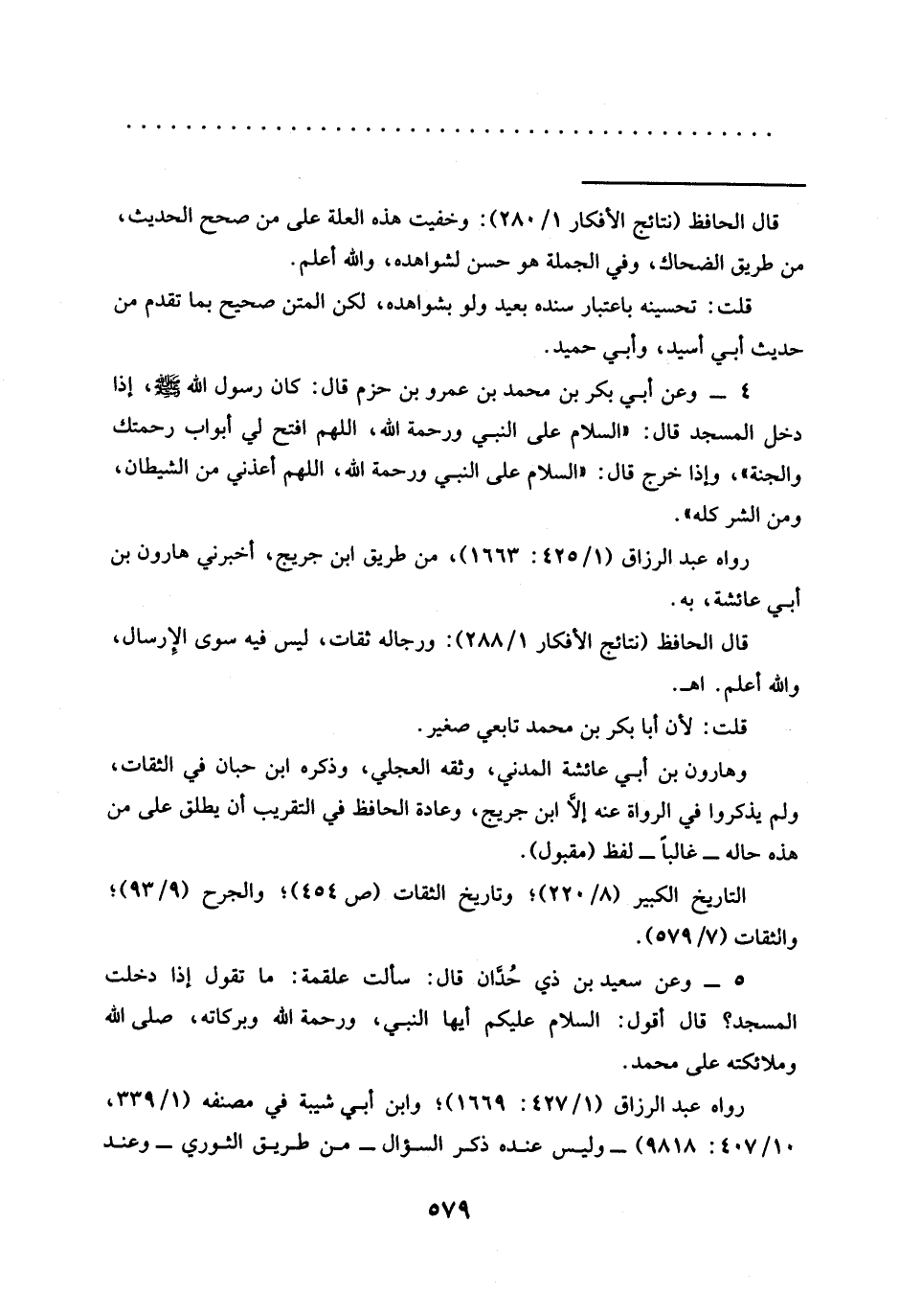 5 - وعن سعيد بن ذي حُدَّان قال: سألت علقمة: ما تقول إذا دخلت المسجد؟ قال أقول: السلام عليكم أيها النبي، ورحمة الله وبركاته، صلى الله وملائكته على محمد.