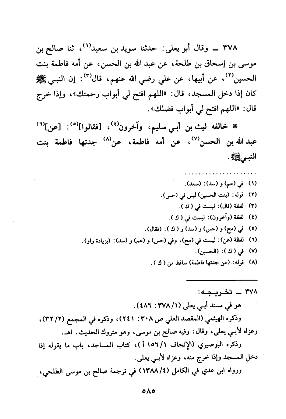 378 - وَقَالَ أَبُو يَعْلَى حَدَّثَنَا سُوَيْدُ بْنُ سَعِيدٍ ثنا صَالِحُ بْنُ مُوسَى بْنِ إِسْحَاقَ بْنِ طَلْحَةَ عَنْ عَبْدِ اللَّهِ بْنِ الْحَسَنِ عَنْ أُمِّهِ فَاطِمَةَ بِنْتِ الْحُسَيْنِ عَنْ أَبِيهَا عَنْ عَلِيٍّ رَضِيَ اللَّهُ عَنْهُم قال إنَّ النَّبِيَّ صَلَّى اللَّهُ عَلَيْهِ وَسَلَّمَ كَانَ §إِذَا دَخَلَ الْمَسْجِدَ قَالَ " اللَّهُمَّ افْتَحْ لِي أَبْوَابَ رَحْمَتِكَ " وَإِذَا خَرَجَ قَالَ " اللَّهُمَّ افْتَحْ لِي أَبْوَابَ فَضْلِكَ " خَالَفَهُ لَيْثُ بْنُ أَبِي سُلَيْمٍ وَآخَرُونَ فَقَالُوا عَنْ عَبْدِ اللَّهِ بْنِ الْحَسَنِ عَنْ أُمِّهِ فَاطِمَةَ عَنْ جَدَّتِهَا فَاطِمَةَ بِنْتِ النَّبِيِّ صَلَّى اللَّهُ عَلَيْهِ وَسَلَّمَ
