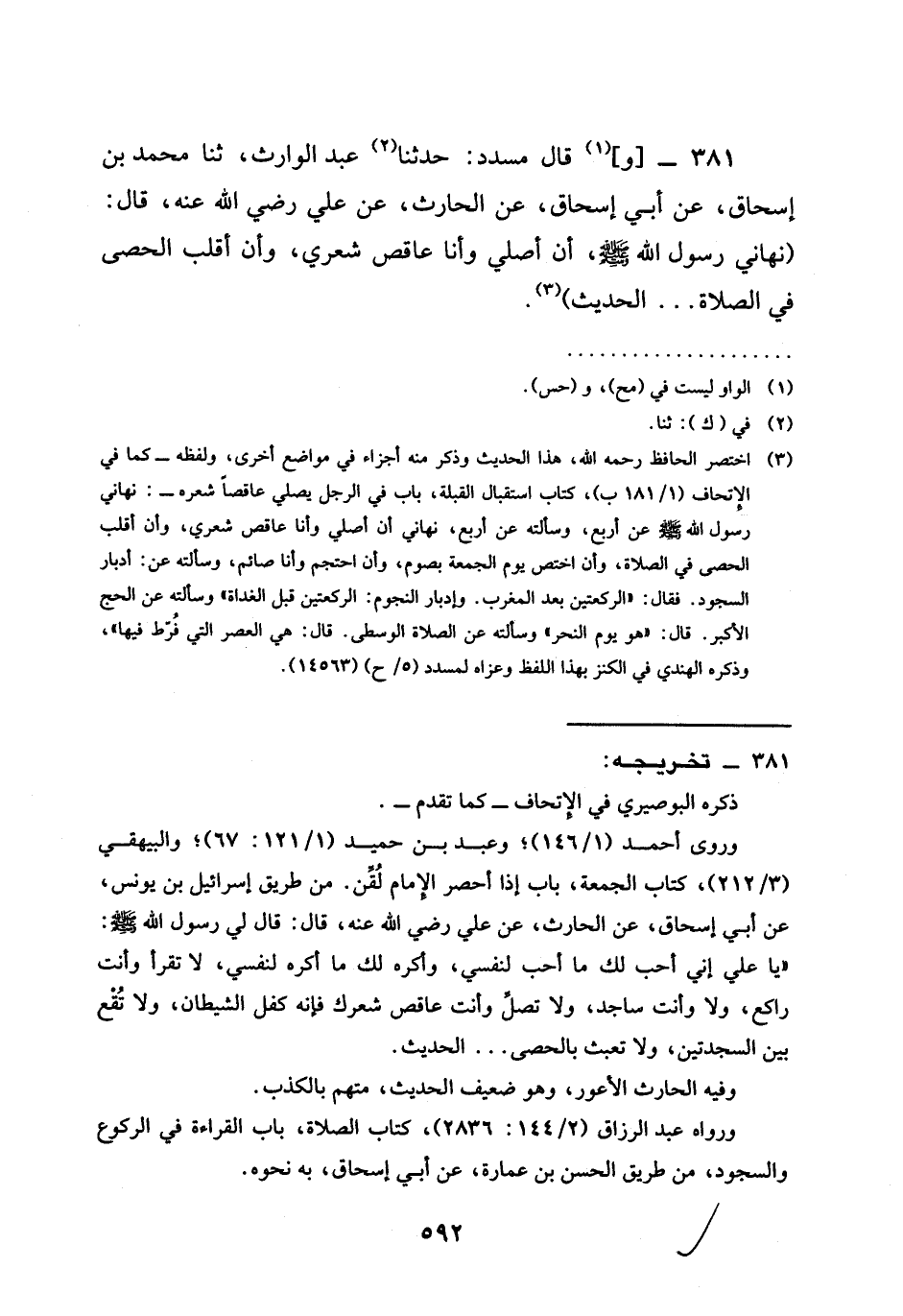 381 - وَقَالَ مُسَدَّدٌ حَدَّثَنَا عَبْدُ الْوَارِثِ ثنا مُحَمَّدُ بْنُ إِسْحَاقَ عَنْ أَبِي إِسْحَاقَ عَنِ الْحَارِثِ عَنْ عَلِيٍّ رَضِيَ اللَّهُ عَنْهُ قَالَ (§نَهَانِي رَسُولُ اللَّهِ صَلَّى اللَّهُ عَلَيْهِ وَسَلَّمَ أَنْ أُصَلِّيَ وَأَنَا عَاقِصٌ شَعْرِي وَأَنْ أُقَلِّبَ الْحَصَى فِي الصَّلَاةِ. . الْحَدِيثَ