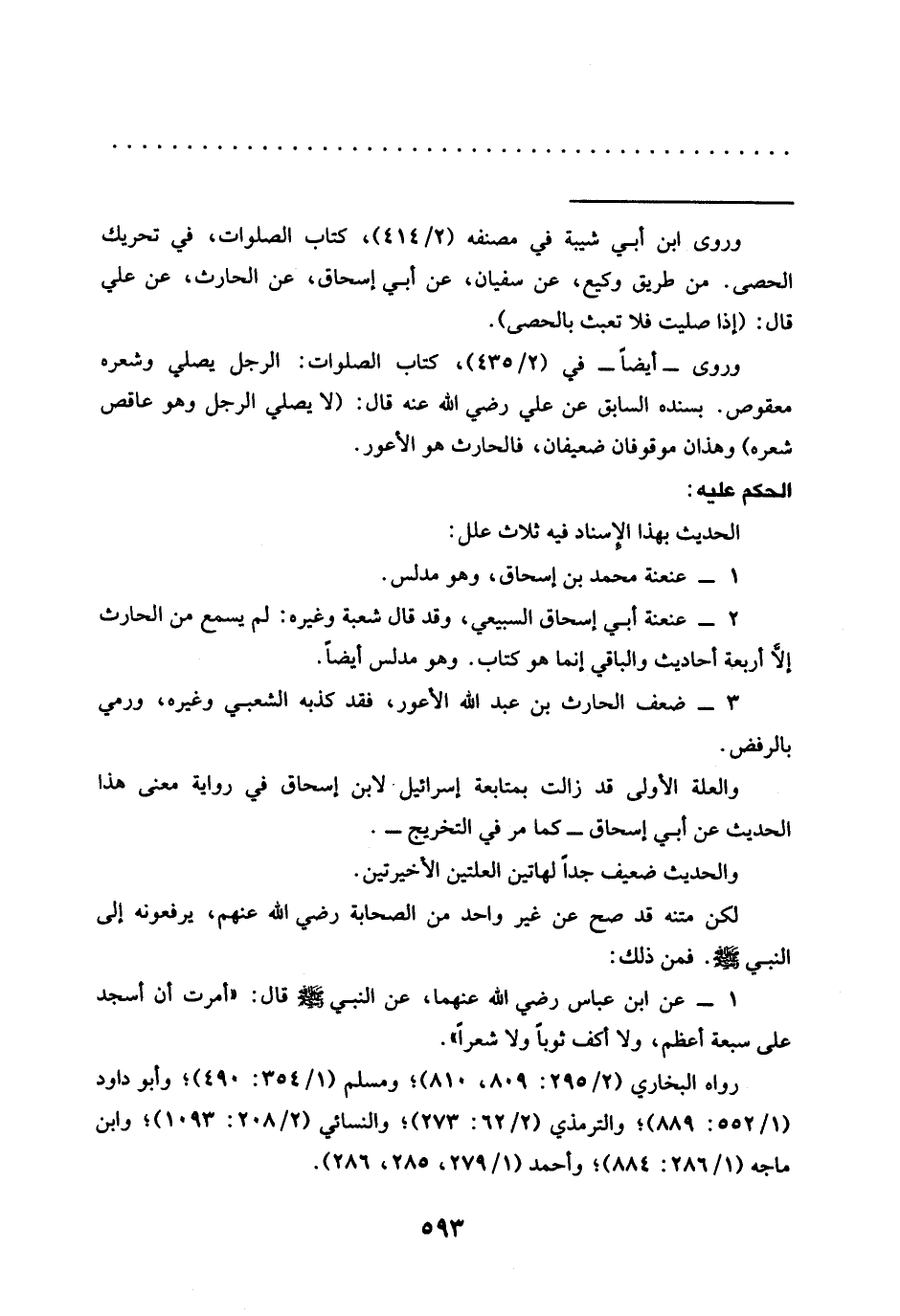 وروى -أيضًا- في (2/ 435)، كتاب الصلوات: الرجل يصلي وشعره معقوص. بسنده السابق عن علي رضي الله عنه قال: إلا يصلي الرجل وهو عاقص شعره) وهذان موقوفان ضعيفان، فالحارث هو الأعور.