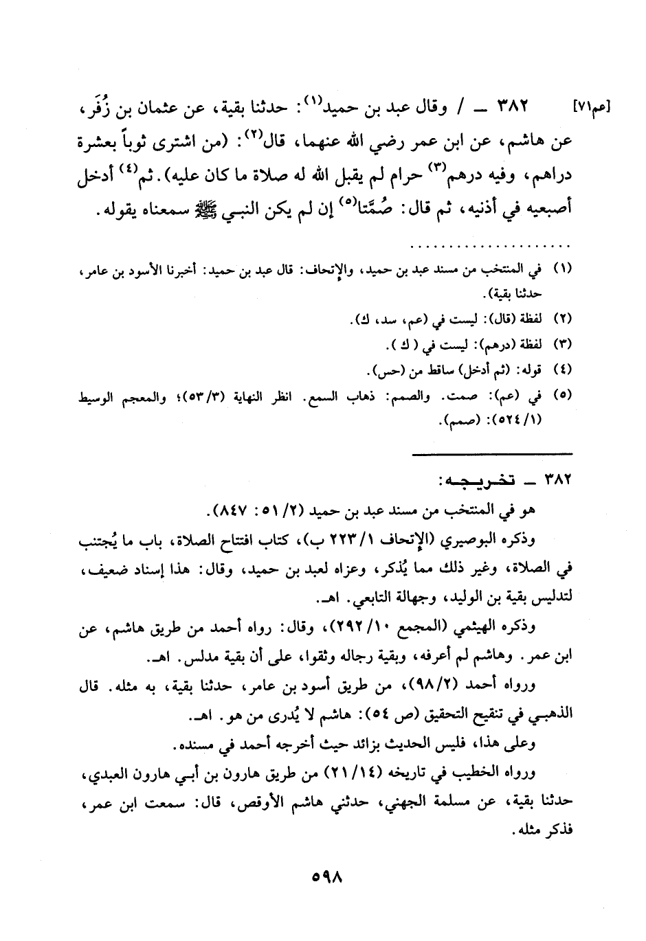 382 - وَقَالَ عَبْدُ بْنُ حُمَيْدٍ حَدَّثَنَا بَقِيَّةُ عَنْ عُثْمَانَ بْنِ زُفَرَ عَنْ هَاشِمٍ عَنِ ابْنِ عُمَرَ رَضِيَ اللَّهُ عَنْهُما قَالَ (§مَنِ اشْتَرَى ثَوْبًا بِعَشَرَةِ دَرَاهِمَ وَفِيهِ دِرْهَمٌ حَرَامٌ لَمْ يَقْبَلِ اللَّهُ لَهُ صَلَاةً مَا كَانَ عَلَيْهِ) ثُمَّ أَدْخَلَ أُصْبُعَيْهِ فِي أُذُنَيْهِ ثُمَّ قَالَ صَمَتَا إِنْ لَمْ يَكُنِ النَّبِيُّ صَلَّى اللَّهُ عَلَيْهِ وَسَلَّمَ سَمِعْنَاهُ يَقُولُهُ