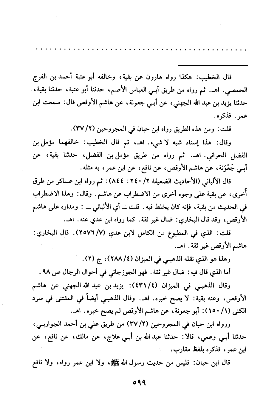 وقال: هذا إسناد شبه لا شيء. اهـ، ثم قال الخطيب: خالفهما مؤمل بن الفضل الحراني. اهـ. ثم رواه من طريق مؤمل بن الفضل، حدثنا بقية، عن أبي جَعْوَنة، عن هاشم الأوقص، عن نافع، عن ابن عمر، به مثله.