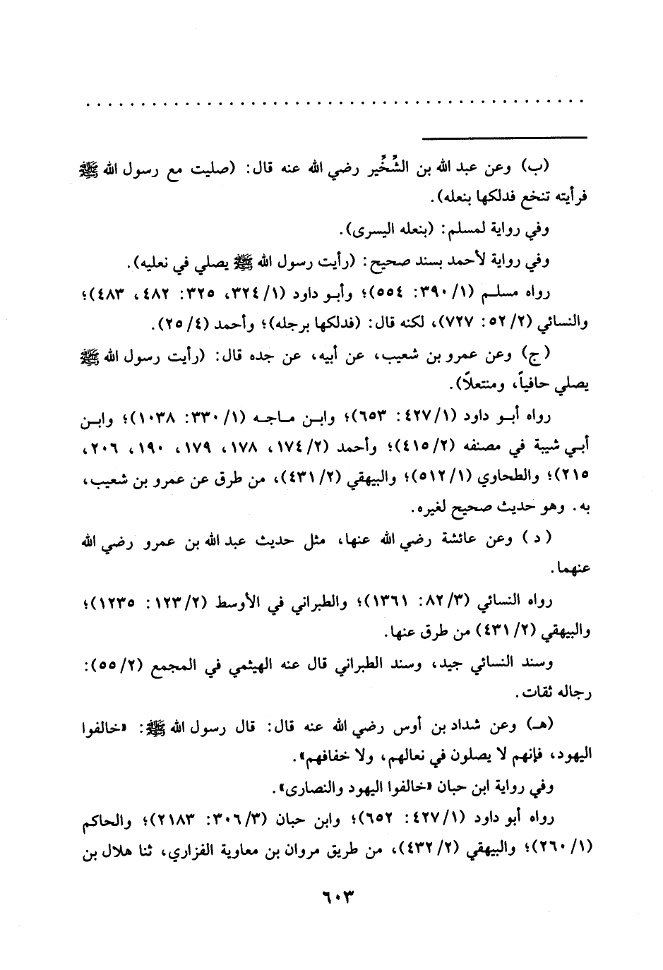 (ج) وعن عَمْرِو بْنِ شُعَيْبٍ، عَنْ أَبِيهِ، عَنْ جَدِّهِ قَالَ: (رَأَيْتُ رَسُولَ اللَّهِ-صَلَّى اللَّهُ عَلَيْهِ وسلم- يصلي حافيًا، ومنتعلًا).