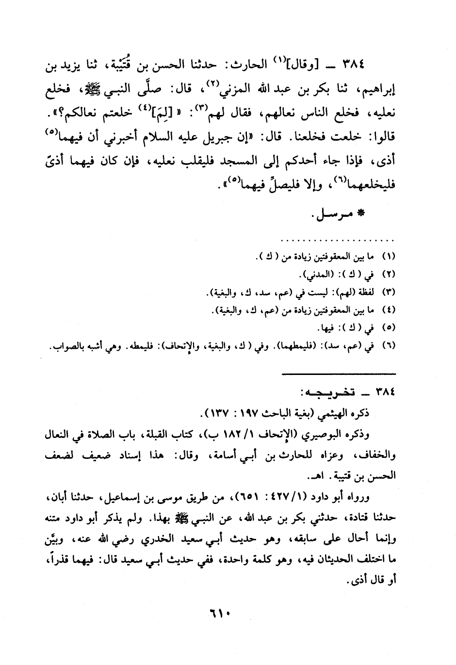 384 - وَقَالَ الْحَارِثُ حَدَّثَنَا الْحَسَنُ بْنُ قُتَيْبَةَ ثنا يَزِيدُ بْنُ إِبْرَاهِيمَ ثنا بَكْرُ بْنُ عَبْدِ اللَّهِ الْمُزَنِيُّ قَالَ صَلَّى النَّبِيُّ صَلَّى اللَّهُ عَلَيْهِ وَسَلَّمَ فَخَلَعَ نَعْلَيْهِ فَخَلَعَ النَّاسُ نِعَالَهُمْ فَقَالَ لَهُمْ " §لِمَ خَلَعْتُمْ نِعَالَكُمْ قَالُوا خَلَعْتَ فَخَلَعْنَا قَالَ " إِنَّ جِبْرِيلَ عَلَيْهِ السَّلَامُ أَخْبَرَنِي أَنَّ فِيهِمَا أَذًى فَإِذَا جَاءَ أَحَدُكُمْ إِلَى الْمَسْجِدِ فَلْيَقْلِبْ نَعْلَيْهِ فَإِنْ كَانَ فِيهِمَا أَذًى فَلْيُخْلَعْهُمَا وَإِلَّا فَلْيُصَلِّ فِيهِمَا "