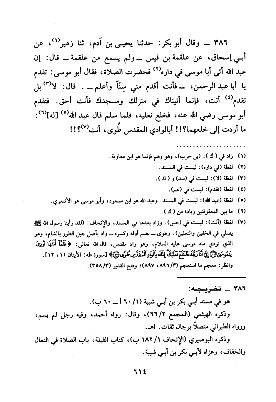 386 - وَقَالَ أَبُو بَكْرٍ حَدَّثَنَا يَحْيَى بْنُ آدَمَ ثنا زُهَيْرٌ عَنْ أَبِي إِسْحَاقَ عَنْ عَلْقَمَةَ بْنِ قَيْسٍ وَلَمْ يَسْمَعْ مِنْ عَلْقَمَةَ قَالَ إِنَّ عَبْدَ اللَّهِ أَتَى أَبَا مُوسَى فِي دَارِهِ فَحَضَرَتِ الصَّلَاةُ فَقَالَ أَبُو مُوسَى تَقَدَّمْ يَا أَبَا عَبْدِ الرَّحْمَنِ فَأَنْتَ أَقْدَمُ مِنِّي سِنًّا وَأَعْلَمُ قَالَ لَا بَلْ تَقَدَّمْ أَنْتَ فَإِنَّمَا أَتَيْنَاكَ فِي مَنْزِلِكَ وَمَسْجِدِكَ فَأَنْتَ أَحَقُّ §فَتَقَدَّمَ أَبُو مُوسَى رَضِيَ اللَّهُ عَنْهُ فَخَلَعَ نَعْلَيْهِ فَلَمَّا سَلَّمَ قَالَ عَبْدُ اللَّهِ لَهُ مَا أَرَدْتَ إِلَى خَلْعِهِمَا أَبِالْوَادِي الْمُقَدَّسِ طُوًى أَنْتَ