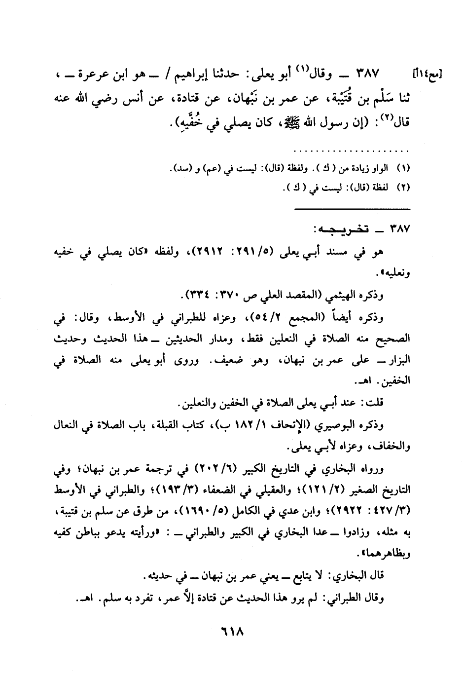 387 - وَقَالَ أَبُو يَعْلَى حَدَّثَنَا إِبْرَاهِيمُ هُوَ ابْنُ عَرْعَرَةَ ثنا سَلْمُ بْنُ قُتَيْبَةَ عَنْ عُمَرَ بْنِ نَبْهَانَ عَنْ قَتَادَةَ عَنْ أَنَسٍ رَضِيَ اللَّهُ عَنْهُ قَالَ (إنَّ رَسُولَ اللَّهِ صَلَّى اللَّهُ عَلَيْهِ وَسَلَّمَ كَانَ §يُصَلِّي فِي خُفَّيْهِ)
