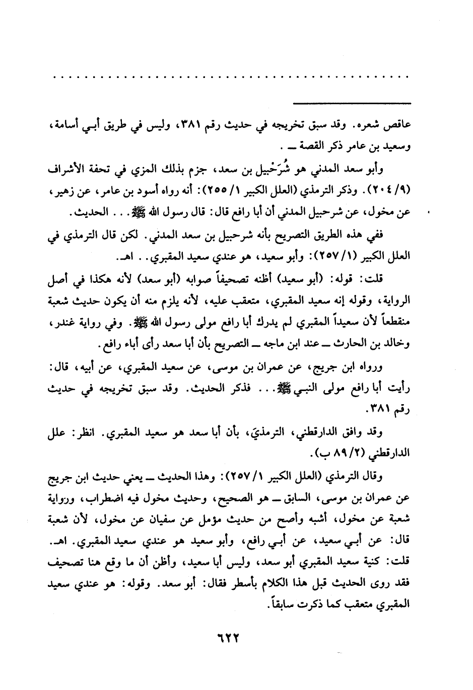قلت: قوله: (أبو سعيد) أظنه تصحيفًا صوابه (أبو سعد) لأنه هكذا في أصل الرواية" وقوله إنه سعيد المقبري، متعقب عليه؛ لأنه يلزم منه أن يكون حديث شعبة منقطعًا لأن سعيدًا المقبري لم يدرك أبا رَافِعٍ مَوْلَى رَسُولِ اللَّهِ - صَلَّى اللَّهُ عَلَيْهِ وَسَلَّمَ -. وفي رواية غندر، وخالد بن الحارث -عند ابن ماجه- التصريح بان أبا سعد رأى أباء رافع. ورواه ابن جريج، عن عمران بن موسى، عن سعيد المقبري، عن أبيه، قال: رأيت أبا رافع مولى النَّبِيِّ -صَلَّى اللَّهُ عَلَيْهِ وَسَلَّمَ- ... فَذَكَرَ الْحَدِيثَ. وقد سبق تخريجه في حديث رقم 381.