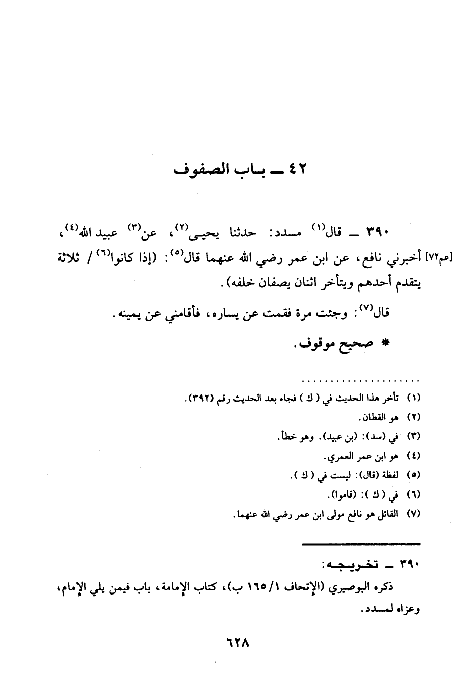 390 - قَالَ مُسَدَّدٌ حَدَّثَنَا يَحْيَى عَنْ عُبَيْدِ اللَّهِ أَخْبَرَنِي نَافِعٌ عَنِ ابْنِ عُمَرَ رَضِيَ اللَّهُ عَنْهُما قَالَ (§إِذَا كَانُوا ثَلَاثَةً يَتَقَدَّمُ أَحَدُهُمْ وَيَتَأَخَّرُ اثْنَانِ يَصُفَّانِ خَلْفَهُ) قَالَ وَجِئْتُ مَرَّةً فَقُمْتُ عَنْ يَسَارِهِ فَأَقَامَنِي عَنْ يَمِينِهِ