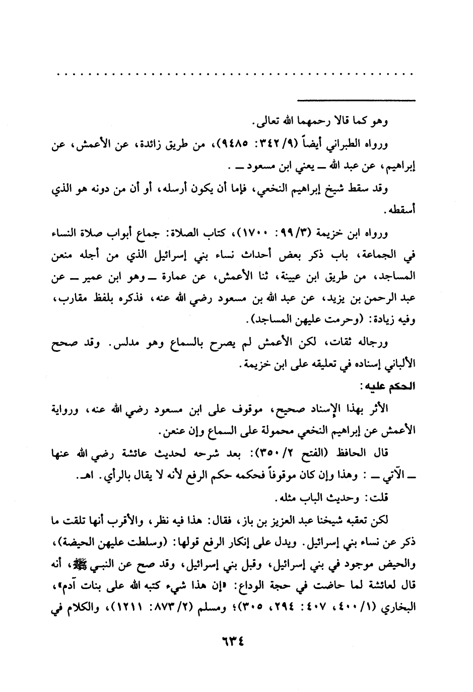 ورواه ابن خزيمة (3/ 99: 1700)، كتاب الصلاة: جماع أبواب صلاة النساء في الجماعة، باب ذكر بعض أحداث نساء بني إسرائيل الذي من أجله منعن المساجد، من طريق ابن عيينة، ثنا الأعمش، عن عمارة -وهو ابن عمير- عَنْ عَبْدِ الرَّحْمَنِ بْنِ يَزِيدَ، عَنْ عَبْدِ اللَّهِ بْنِ مَسْعُودٍ رَضِيَ اللَّهُ عنه، فذكره بلفظ مقارب،