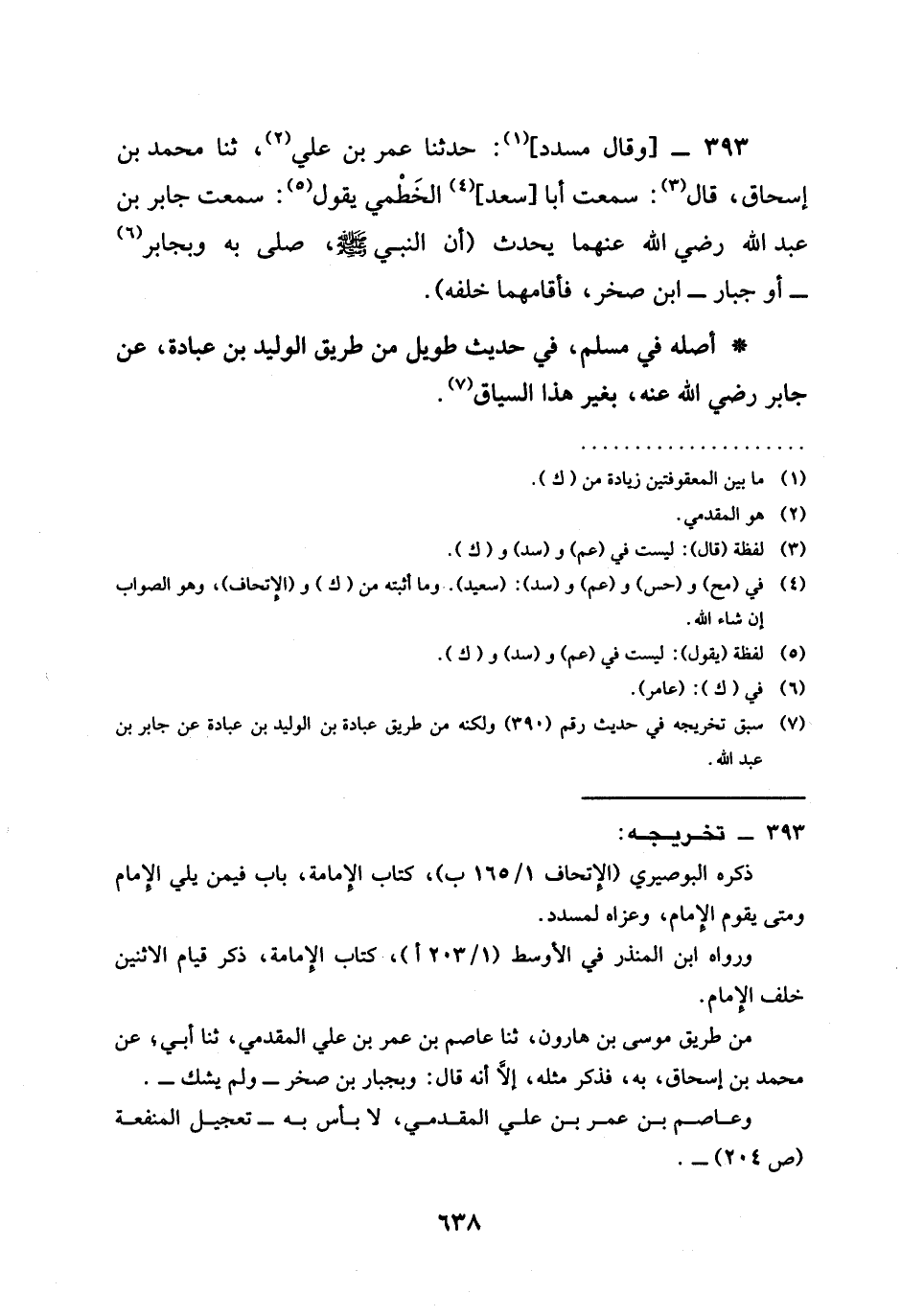 393 - وَقَالَ مُسَدَّدٌ حَدَّثَنَا عُمَرُ بْنُ عَلِيٍّ ثنا مُحَمَّدُ بن إسحاق قال سَمِعْتُ أَبَا سعد الخطمي يقول سَمِعْتُ جَابِرَ بْنَ عبد الله رضي الله عنهما يُحَدِّثُ (أَنَّ النَّبِيَّ صَلَّى اللَّهُ عَلَيْهِ وَسَلَّمَ صَلَّى بِهِ وَبِجَابِرٍ أَوْ جَبَّارِ ابن صَخْرٍ §فَأَقَامَهُمَا خَلْفَهُ)