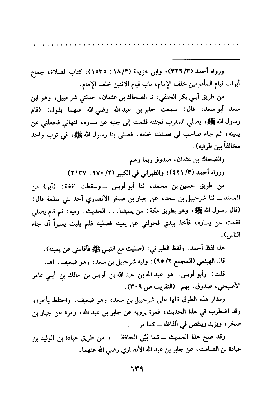 من طريق أبي بكر الحنفي، نا الضحاك بن عثمان، حدثني شرحبيل، وهو ابن سعد أبو سعد، قال: سمعت جابر بن عبد الله رضي الله عنهما يقول: (قَامَ رَسُولُ اللَّهِ -صَلَّى اللَّهُ عَلَيْهِ وَسَلَّمَ-، يُصَلِّي المغرب فجئته فقمت إلى جنبه عن يساره، فنهاني فجعلني عن يمينه، ثم جاء صاحب لي فصففنا خلفه، فصلى بِنَا رَسُولُ اللَّهِ -صَلَّى اللَّهُ عَلَيْهِ وَسَلَّمَ-، في ثوب واحد مخالفًا بين طرفيه).