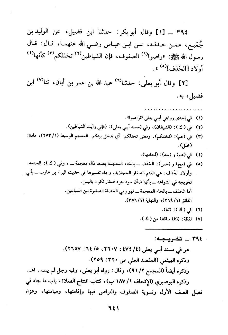 394 -[1] وَقَالَ أَبُو بَكْرٍ حَدَّثَنَا ابْنُ فُضَيْلٍ عَنِ الْوَلِيدِ بْنِ جُمَيْعٍ عَمَّنْ حَدَّثَهُ عَنِ ابْنِ عَبَّاسٍ رَضِيَ اللَّهُ عَنْهُما قَالَ قَالَ رَسُولُ اللَّهِ صَلَّى اللَّهُ عَلَيْهِ وَسَلَّمَ " §رَاصُّوا الصُّفُوفَ فَإِنَّ الشياطين تخللكم كأنه أَوْلَادُ الْحَذَفِ