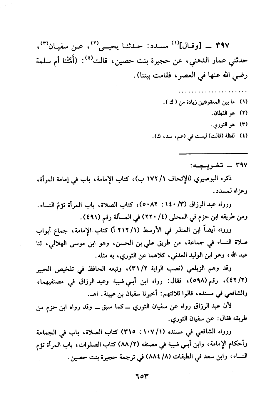 397 - وَقَالَ مُسَدَّدٌ حَدَّثَنَا يَحْيَى عَنْ سُفْيَانَ حَدَّثَنِي عَمَّارٍ الدُّهْنِيِّ عَنْ حُجَيْرَةَ بِنْتِ حُصَيْنٍ قَالَتْ (§أَمَّتْنَا أُمُّ سَلَمَةَ رَضِيَ اللَّهُ عَنْها فِي الْعَصْرِ فَقَامَتْ بَيْنَنَا)
