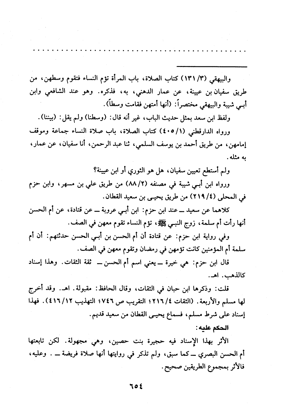 كلاهما عن سعيد -عند ابن حزم: ابن أبي عروبة- عن قتادة، عن أم الحسن أنها رأت أُمِّ سَلَمَةَ، زَوْجِ النَّبِيِّ -صَلَّى اللَّهُ عَلَيْهِ وسلم-، تؤم النساء تقوم معهن في الصف.
