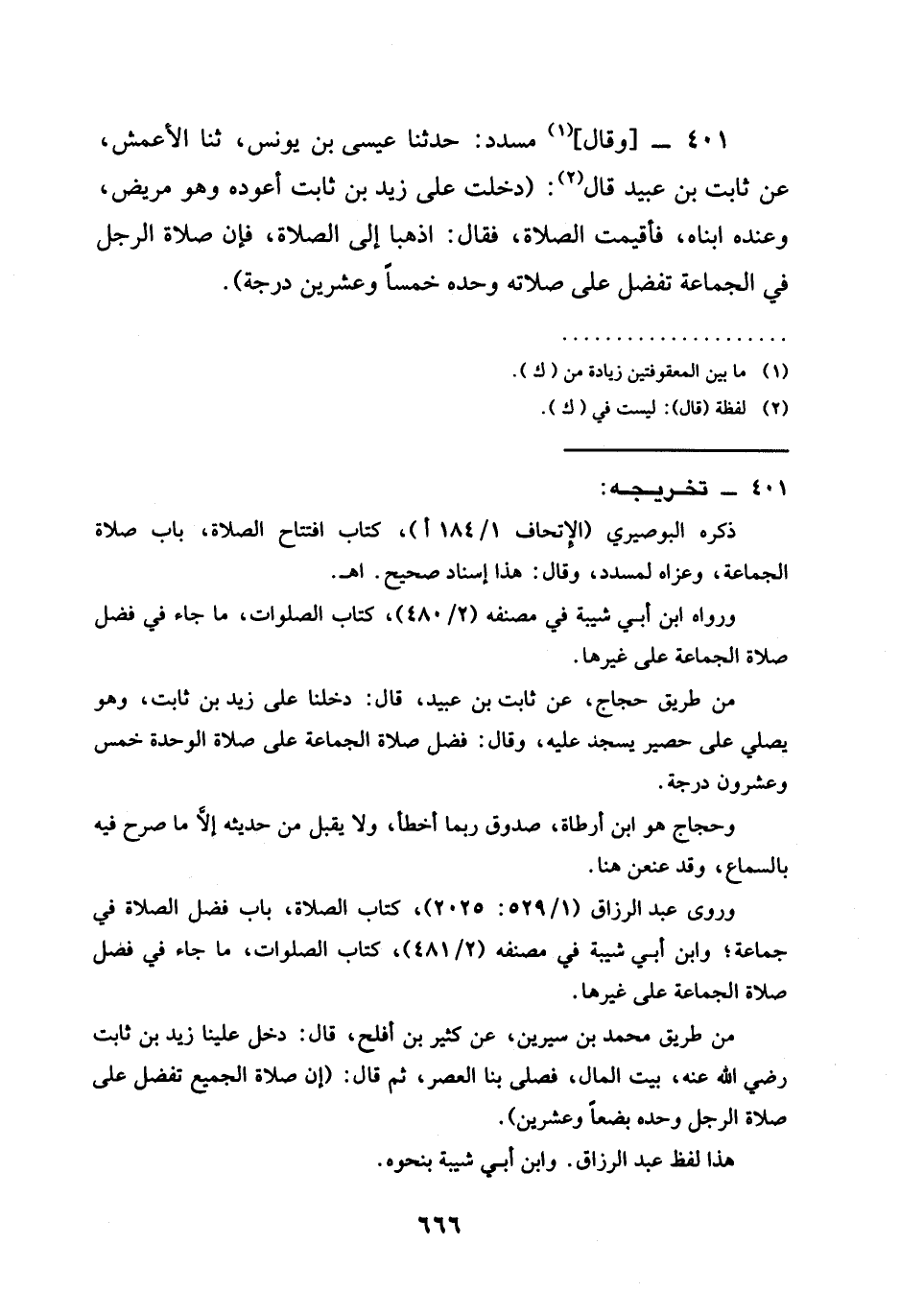 401 - وَقَالَ مُسَدَّدٌ حَدَّثَنَا عِيسَى بْنُ يُونُسَ ثنا الْأَعْمَشُ عَنْ ثَابِتِ بْنِ عُبَيْدٍ قَالَ (دَخَلْتُ عَلَى زِيدِ بْنِ ثَابِتٍ أَعُودُهُ وَهُوَ مَرِيضٌ وَعِنْدَهُ ابْنَاهُ فَأُقِيمَتِ الصَّلَاةُ فَقَالَ اذْهَبَا إِلَى الصَّلَاةِ فَإِنَّ §صَلَاةَ الرَّجُلِ فِي الْجَمَاعَةِ تَفْضُلُ عَلَى صَلَاتِهِ وَحْدَهُ خَمْسًا وَعِشْرِينَ دَرَجَةً)