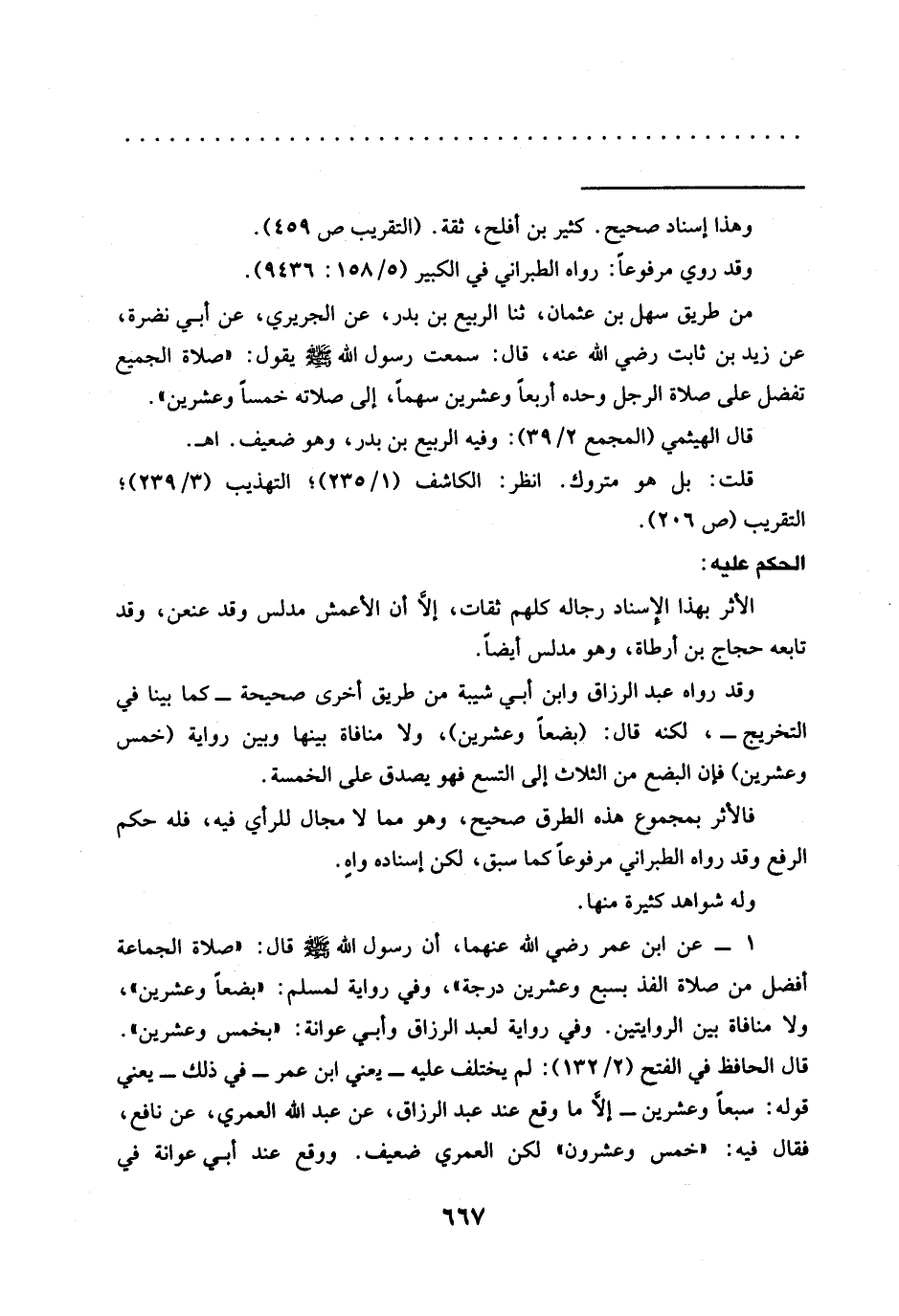 1 - عَنِ ابْنِ عُمَرَ رَضِيَ اللَّهُ عَنْهُمَا، أَنَّ رسول الله -صلى الله عليه وسلم- قال:"صلاة الجماعة أفضل من صلاة الفذ بسبع وعشرين درجة"، وفي رواية لمسلم:" بضعًا وعشرين"، ولا منافاة بين الروايتين. وفي رواية لعبد الرزاق وأبي عوانة: "بخمس وعشرين".