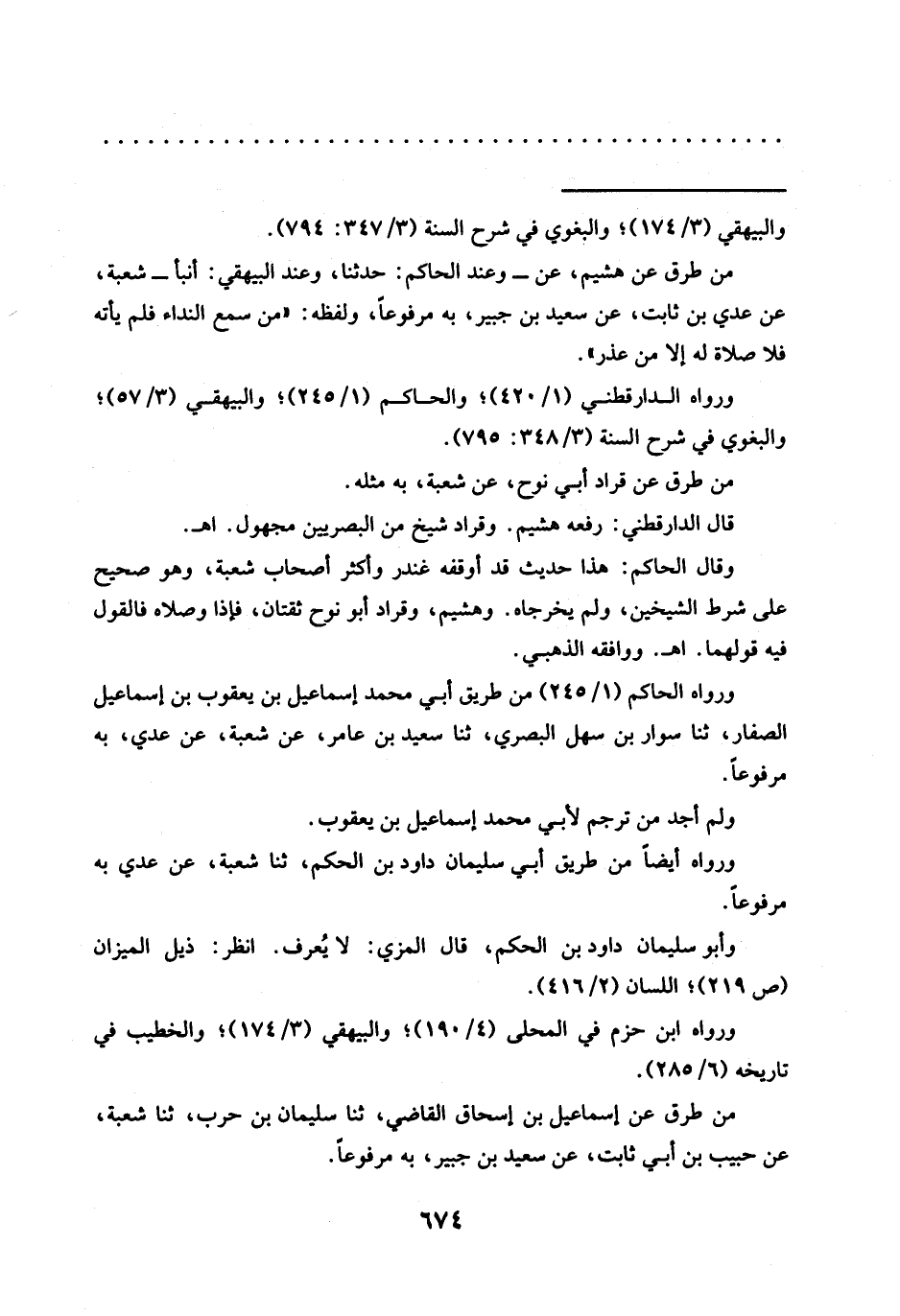 من طرق عن هشيم، عن -وعند الحاكم: حدثنا، وعند البيهقي: أنبأ- شعبة، عن عدي بن ثابت، عن سعيد بن جبير، به مرفوعًا، ولفظه: "من سمع النداء فلم يأته فلا صلاة له إلا من عذر".