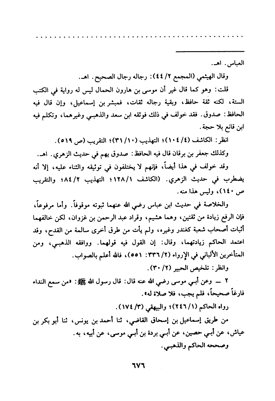 قلت: وهو كما قال غير أن موسى بن هارون الحمال ليس له رواية في الكتب الستة، لكنه ثقة حافظ، وبقية رجاله ثقات، فمبشر بن إسماعيل، وإن قال فيه الحافظ: صدوق. فقد خولف في ذلك فوثقه ابن سعد والذهبي وغيرهما، وتكلم فيه ابن قانع بلا حجة.