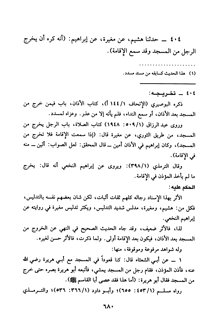 404 - حَدَّثَنَا هُشَيْمٌ عَنِ مغيرة عَنْ إِبْرَاهِيمَ (§أَنَّهُ كَرِهَ أَنْ يَخْرُجَ الرَّجُلُ مِنَ الْمَسْجِدِ وَقَدْ سَمِعَ الْإِقَامَةَ)