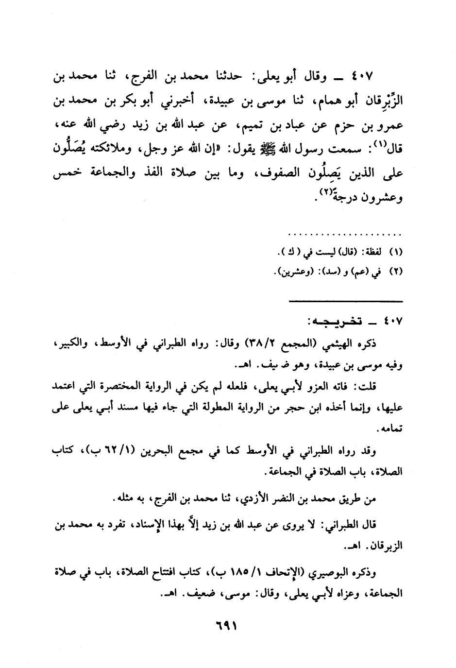 407 - وَقَالَ أَبُو يَعْلَى حَدَّثَنَا مُحَمَّدُ بْنُ الْفَرَجِ ثنا مُحَمَّدُ بْنُ الزِّبْرِقَانِ أَبُو هَمَّامٍ ثنا مُوسَى بْنُ عُبَيْدَةَ أَخْبَرَنِي أَبُو بَكْرِ بْنُ مُحَمَّدِ بْنِ عَمْرِو بْنِ حَزْمٍ عَنْ عَبَّادِ بْنِ تَمِيمٍ عَنْ عَبْدِ اللِّهِ بْنِ زَيْدٍ رَضِيَ اللَّهُ عَنْهُ قال سَمِعْتُ رَسُولَ اللَّهِ صَلَّى اللَّهُ عَلَيْهِ وَسَلَّمَ يَقُولُ " إِنَّ اللَّهَ عَزَّ وَجَلَّ وَمَلَائِكَتَهُ يُصَلُّونَ عَلَى الَّذِينَ يَصِلُونَ الصُّفُوفَ وَمَا §بَيْنَ صَلَاةِ الْفَذِّ وَالْجَمَاعَةِ خَمْسٌ وَعِشْرُونَ دَرَجَةً