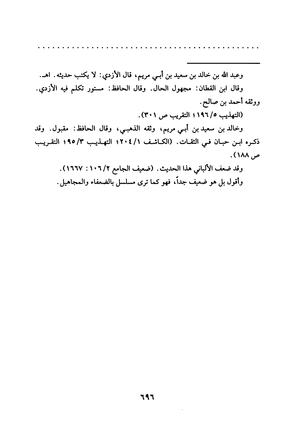 وخالد بن سعيد بن أبي مريم، وثقه الذهبي، وقال الحافظ: مقبول. وقد ابن حبان في الثقات. (الكاشف 1/ 204؛ التهذيب 3/ 95؛ التقريب ص 188).