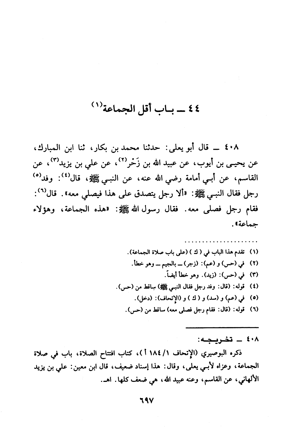 408 - قَالَ أَبُو يَعْلَى حَدَّثَنَا مُحَمَّدُ بْنُ بَكَّارٍ ثنا ابْنُ الْمُبَارَكِ عَنْ يَحْيَى بْنِ أَيُّوبَ عَنْ عُبَيْدِ اللَّهِ بْنِ زَحْرٍ عَنْ عَلِيِّ بْنِ يَزِيدَ عَنِ الْقَاسِمِ عَنْ أَبِي أُمَامَةَ رَضِيَ اللَّهُ عَنْهُ عَنِ النَّبِيِّ صَلَّى اللَّهُ عَلَيْهِ وَسَلَّمَ قَالَ وَفَدَ رَجُلٌ فَقَالَ النَّبِيُّ صَلَّى اللَّهُ عَلَيْهِ وَسَلَّمَ " §أَلَا رَجُلٌ يَتَصَدَّقُ عَلَى هَذَا فَيُصَلِّي مَعَهُ " قَالَ فَقَامَ رَجُلٌ فَصَلَّى مَعَهُ فَقَالَ رَسُولُ اللَّهِ صَلَّى اللَّهُ عَلَيْهِ وَسَلَّمَ " هَذِهِ الْجَمَاعَةُ وَهَؤُلَاءِ جَمَاعَةٌ "