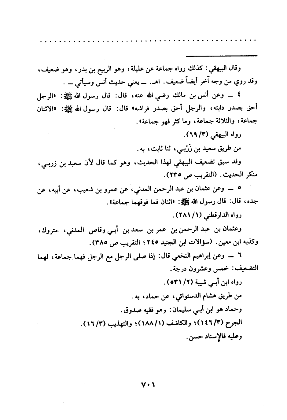5 - وعن عثمان بن عبد الرحمن المدني، عَنْ عَمْرِو بْنِ شُعَيْبٍ، عَنْ أَبِيهِ، عَنْ جَدِّهِ، قَالَ: قَالَ رَسُولُ اللَّهِ -صَلَّى اللَّهُ عليه وسلم-: "اثنان فما فوقهما جماعة".