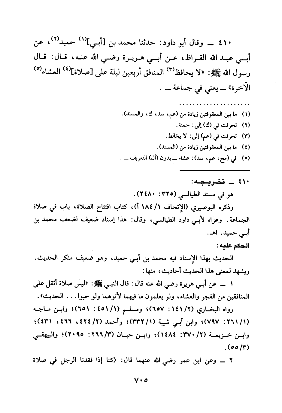 410 - وَقَالَ أَبُو دَاوُدَ حَدَّثَنَا مُحَمَّدُ بْنُ أَبِي حُمَيْدٍ عَنْ أَبِي عَبْدِ اللَّهِ الْقَرَّاظِ عَنْ أَبِي هُرَيْرَةَ رَضِيَ اللَّهُ عَنْهُ قَالَ قَالَ رَسُولُ اللَّهِ صَلَّى اللَّهُ عَلَيْهِ وَسَلَّمَ " §لَا يُحَافِظُ الْمُنَافِقُ أَرْبَعِينَ لَيْلَةً عَلَى صَلَاةِ الْعِشَاءِ الْآخِرَةِ يَعْنِي فِي جَمَاعَةٍ