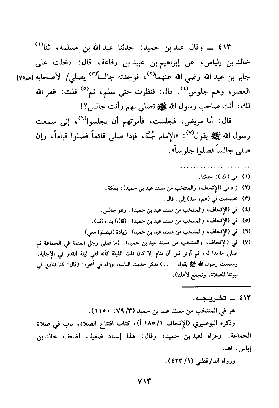 413 - وَقَالَ عَبْدُ بْنُ حُمَيْدٍ حَدَّثَنَا عَبْدُ اللَّهِ بْنُ مَسْلَمَةَ ثنا خَالِدُ بْنُ إِلْيَاسَ عَنْ إِبْرَاهِيمَ بْنِ عُبَيْدِ بْنِ رِفَاعَةَ قَالَ دَخَلْتُ عَلَى جَابِرِ بْنِ عَبْدِ اللَّهِ رَضِيَ اللَّهُ عَنْهُما فَوَجَدْتُهُ جَالِسًا يُصَلِّي لِأَصْحَابِهِ الْعَصْرَ وَهُمْ جُلُوسٌ قَالَ فَنَظَرْتُ حَتَّى سَلَّمَ ثُمَّ قُلْتُ غَفَرَ اللَّهُ لَكَ أَنْتَ صَاحِبُ رَسُولِ اللَّهِ صَلَّى اللَّهُ عَلَيْهِ وَسَلَّمَ تُصَلِّي بِهِمْ وَأَنْتَ جَالِسٌ قَالَ أَنَا مَرِيضٌ فَجَلَسْتُ فَأَمَرْتُهُمْ أَنْ يَجْلِسُوا إِنِّي سَمِعْتُ رَسُولَ اللَّهِ صَلَّى اللَّهُ عَلَيْهِ وَسَلَّمَ يَقُولُ §الْإِمَامُ جُنَّةٌ فَإِذَا صَلَّى قَائِمًا فَصَلُّوا قِيَامًا وَإِنْ صَلَّى جَالِسًا فَصَلُّوا جُلُوسًا "