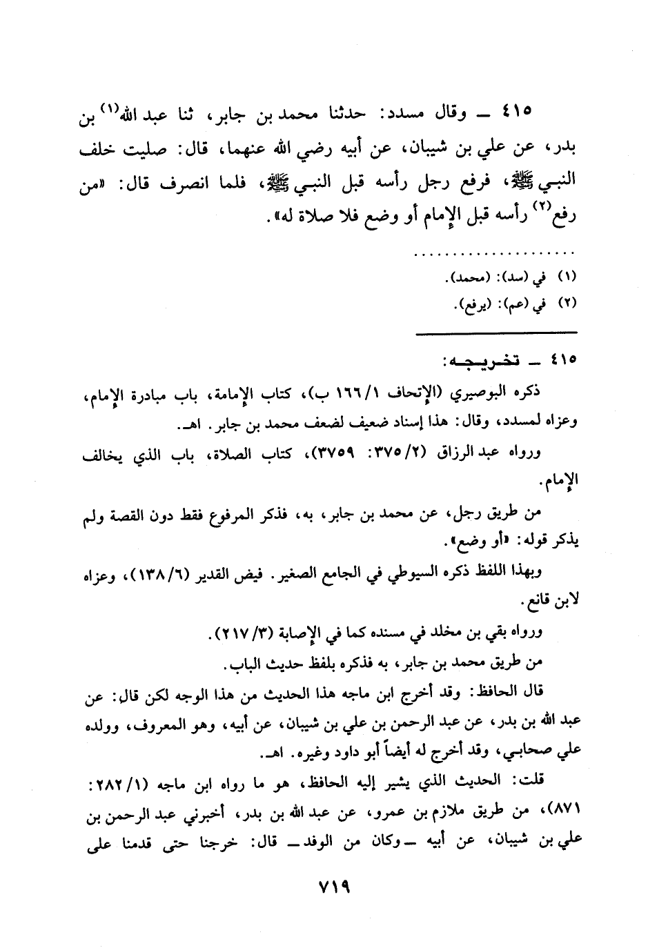 415 - وَقَالَ مُسَدَّدٌ حَدَّثَنَا مُحَمَّدُ بْنُ جَابِرٍ ثنا عَبْدُ اللَّهِ بْنُ بَدْرٍ عَنْ عَلِيِّ بْنِ شَيْبَانَ عَنْ أَبِيهِ رَضِيَ اللَّهُ عَنْهُما قَالَ صَلَّيْتُ خَلْفَ النَّبِيِّ صَلَّى اللَّهُ عَلَيْهِ وَسَلَّمَ فَرَفَعَ رَجُلٌ رَأْسَهُ قَبْلَ النَّبِيِّ صَلَّى اللَّهُ عَلَيْهِ وَسَلَّمَ فَلَمَّا انْصَرَفَ قَالَ " §مَنْ رَفَعَ رَأْسَهُ قَبْلَ الْإِمَامِ أَوْ وَضَعَ فَلَا صَلَاةَ لَهُ "