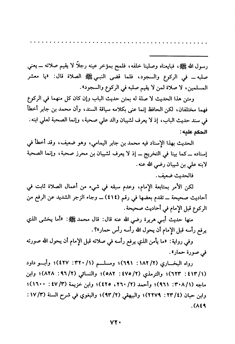 لكن الأمر بمتابعة الإِمام، وعدم سبقه في شيء من أعمال الصلاة ثابت في أحاديث صحيحة -تقدم بعضها في رقم (414) - وجاء الزجر الشديد عن الرفع من الركوع قبل الإِمام في أحاديث صحيحة.