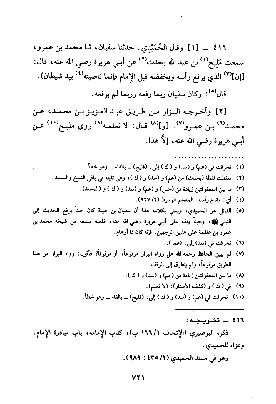416 -[1] وَقَالَ الْحُمَيْدِيُّ حَدَّثَنَا سُفْيَانُ ثنا مُحَمَّدُ بْنُ عَمْرٍو سَمِعْتُ مَلِيحَ بْنَ عَبْدِ اللَّهِ يُحَدِّثُ عَنْ أَبِي هُرَيْرَةَ رَضِيَ اللَّهُ عَنْهُ قَالَ إِنَّ §الَّذِي يَرْفَعُ رَأْسَهُ وَيَخْفِضُهُ قَبْلَ الْإِمَامِ فَإِنَّمَا نَاصِيَتُهُ بِيَدِ شَيْطَانٍ قَالَ وَكَانَ سُفْيَانُ رُبَّمَا رَفَعَهُ وَرُبَّمَا لَمْ يَرْفَعْهُ