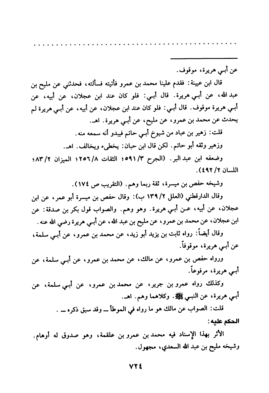 قال ابن عيينة: فقدم علينا محمد بن عمرو فأتيته فسألته، فحدثني عن مليح بن عبد الله، عن أبي هريرة. قال أبي: فلو كان عند ابن عجلان، عن أبيه، عن أبي هريرة موقوف. قال أبي: فلو كان عند ابن عجلان، عن أبيه، عن أبي هريرة لم يحدث عن محمد بن عمرو، عن مليح، عن أبي هريرة. اهـ.