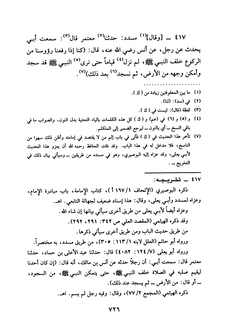 417 - وَقَالَ مُسَدَّدٌ حَدَّثَنَا مُعْتَمِرٌ قَالَ سَمِعْتُ أَبِي يُحَدِّثُ عَنْ رَجُلٍ عَنْ أَنَسٍ رَضِيَ اللَّهُ عَنْهُ قَالَ (كُنَّا إِذَا رَفَعْنَا رؤوسنا مِنَ الرُّكُوعِ خَلْفَ النَّبِيِّ صَلَّى اللَّهُ عَلَيْهِ وَسَلَّمَ §لَمْ نَزَلْ قِيَامًا حَتَّى نَرَى النَّبِيَّ صَلَّى اللَّهُ عَلَيْهِ وَسَلَّمَ قَدْ سَجَدَ وَأَمْكَنَ وَجْهَهُ مِنَ الْأَرْضِ ثُمَّ نَسْجُدُ بَعْدَ ذَلِكَ)
