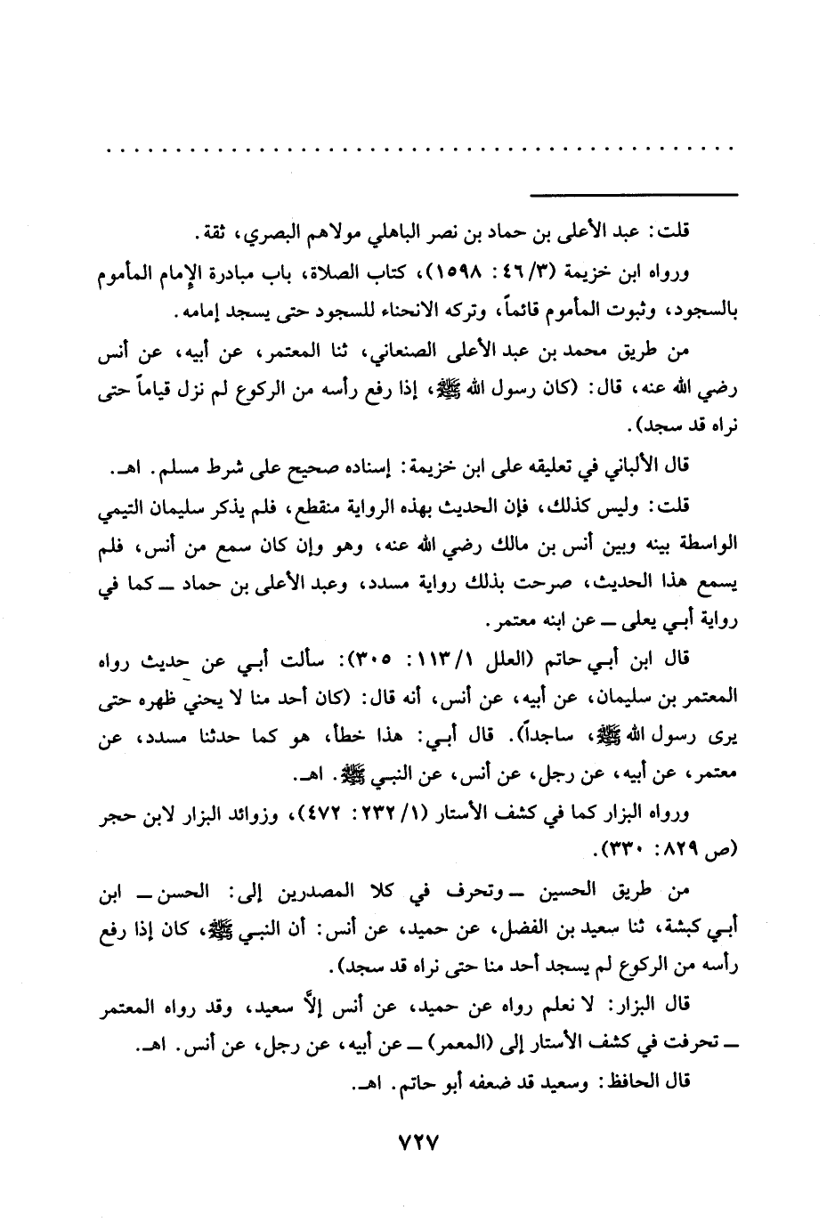 من طريق محمد بن عبد الأعلى الصنعاني، ثنا المعتمر، عَنْ أَبِيهِ، عَنْ أَنَسٍ رَضِيَ اللَّهُ عَنْهُ، قَالَ: (كَانَ رَسُولُ اللَّهِ-صلى الله عليه وسلم-، إذا رفع رأسه من الركوع لم نزل قيامًا حتى نراه قد سجد).