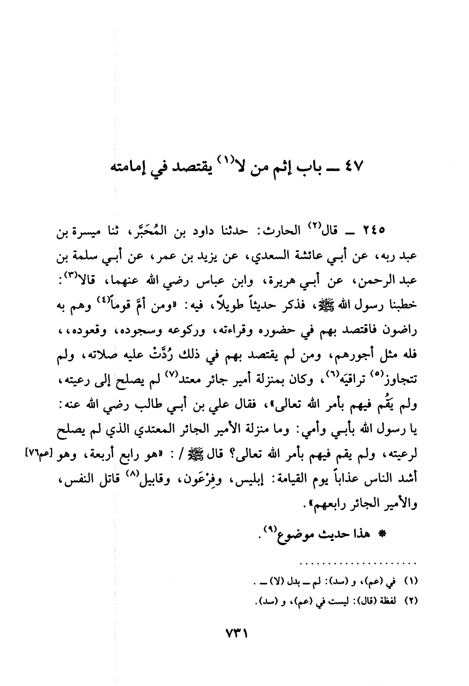 245 - قَالَ الْحَارِثُ حَدَّثَنَا دَاوُدُ بْنُ الْمُحَبَّرِ ثنا مَيْسَرَةُ بْنُ عَبْدِ رَبِّهِ عَنْ أَبِي عَائِشَةَ السَّعْدِيِّ عَنْ يزيد بن عمر عَنْ أَبِي سَلَمَةَ بْنِ عَبْدِ الرَّحْمَنِ عَنْ أَبِي هُرَيْرَةَ وَابْنِ عَبَّاسٍ رَضِيَ اللَّهُ عَنْهُما قَالَا خَطَبَنَا رَسُولُ اللَّهِ صَلَّى اللَّهُ عَلَيْهِ وَسَلَّمَ فَذَكَرَ حَدِيثًا طَوِيلًا فِيهِ " §وَمَنْ أَمَّ قَوْمًا وَهُمْ بِهِ رَاضُونَ فَاقْتَصَدَ بِهِمْ فِي حُضُورِهِ وَقِرَاءَتِهِ وَرُكُوعِهِ وَسُجُودِهِ وَقُعُودِهِ فَلَهُ مِثْلُ أُجُورِهِمْ وَمَنْ لَمْ يَقْتَصِدْ بِهِمْ فِي ذَلِكِ رُدَّتْ عَلَيْهِ صَلَاتُهُ وَلَمْ تَتَجَاوَزْ تَرَاقِيَهُ وَكَانَ بِمَنْزِلَةِ أَمِيرٍ جَائِرٍ مُعْتَدٍ لَمْ يُصْلِحْ إِلَى رَعِيَّتِهِ وَلَمْ يَقُمْ فِيهِمْ بِأَمْرِ اللَّهِ تَعَالَى فَقَالَ عَلِيُّ بْنُ أَبِي طَالِبٍ رَضِيَ اللَّهُ عَنْهُ يَا رَسُولَ اللَّهِ بِأَبِي وَأُمِّي وَمَا مَنْزِلَةُ الْأَمِيرِ الْجَائِرِ الْمُعْتَدِي الَّذِي لَمْ يُصْلِحْ لِرَعِيَّتِهِ وَلَمْ يَقُمْ فِيهِمْ بِأَمْرٍ اللَّهِ تَعَالَى قَالَ صَلَّى اللَّهُ عَلَيْهِ وَسَلَّمَ هُوَ رَابِعُ أَرْبَعَةٍ وَهُوَ أَشَدُّ النَّاسِ عَذَابًا يَوْمَ الْقِيَامَةِ إِبْلِيسُ وَفِرْعَوْنُ وَقَابِيلُ قَاتِلُ النَّفْسِ وَالْأَمِيرُ الْجَائِرُ رَابِعُهُمْ "