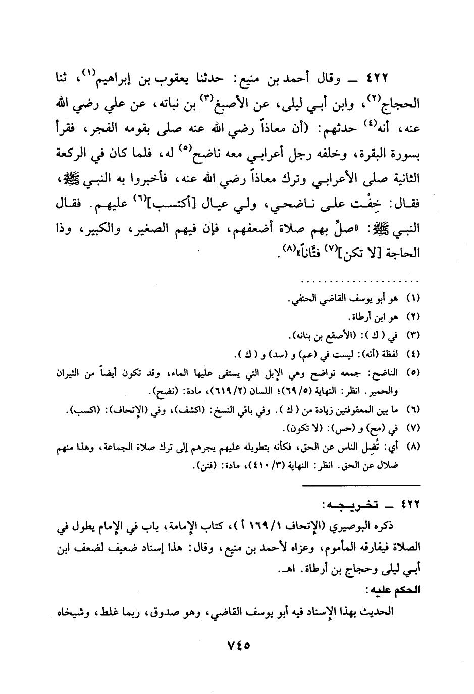 422 - وَقَالَ أَحْمَدُ بْنُ مَنِيعٍ حَدَّثَنَا يَعْقُوبُ بْنُ إِبْرَاهِيمَ ثنا الْحَجَّاجُ وَابْنُ أَبِي لَيْلَى عَنِ الْأَصْبَغِ بْنِ نُبَاتَةَ عَنْ عَلِيٍّ رَضِيَ اللَّهُ عَنْهُ أَنَّهُ حَدَّثَهُمْ أَنَّ مُعَاذًا رَضِيَ اللَّهُ عَنْهُ صَلَّى بِقَوْمِهِ الْفَجْرَ فَقَرَأَ بِسُورَةِ الْبَقَرَةِ وَخَلْفَهُ رَجُلٌ أَعْرَابِيٌّ مَعَهُ نَاضِحٌ لَهُ فَلَمَّا كَانَ فِي الرَّكْعَةِ الثَّانِيَةِ صَلَّى الْأَعْرَابِيُّ وَتَرَكَ مُعَاذًا رَضِيَ اللَّهُ عَنْهُ فَأَخْبَرُوا بِهِ النَّبِيَّ صَلَّى اللَّهُ عَلَيْهِ وَسَلَّمَ فَقَالَ خِفْتُ عَلَى نَاضِحِي وَلِي عِيَالٌ أَكْتَسِبُ عَلَيْهِمْ فَقَالَ النَّبِيُّ صَلَّى اللَّهُ عَلَيْهِ وَسَلَّمَ " §صَلِّ بِهِمْ صَلَاةَ أَضْعَفِهِمْ فَإِنَّ فِيهِمُ الصَّغِيرَ وَالْكَبِيرَ وَذَا الْحَاجَةِ لَا تَكُنْ فَتَّانًا "