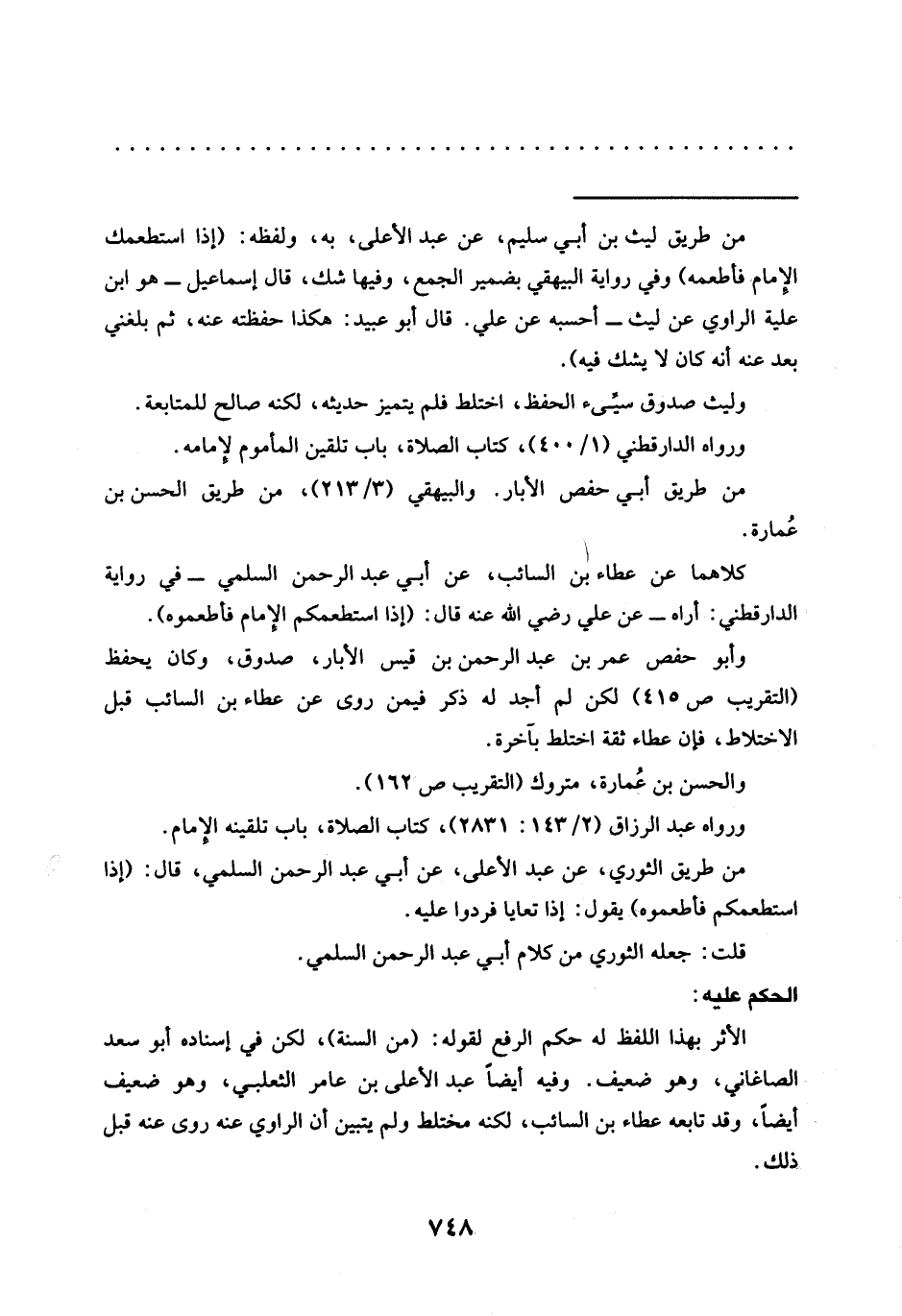 = من طريق ليث بن أبي سليم، عن عبد الأعلى، به، ولفظه: (إذا استطعمك الإِمام فأطعمه) وفي رواية البيهقي بضمير الجمع، وفيها شك، قال إسماعيل -هو ابن علية الراوي عن ليث- أحسبه عن علي. قال أبو عبيد: هكذا حفظته عنه، ثم بلغني بعد عنه أنه كان لا يشك فيه).