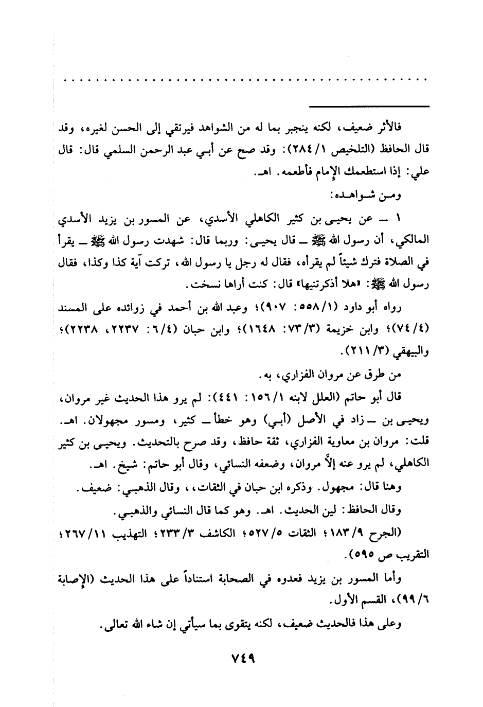 قال أبو حاتم (العلل لابنه 1/ 156: 441): لم يرو هذا الحديث غير مروان، ويحيى بن -زاد في الأصل (أبي) وهو خطأ- كثير، ومسور مجهولان. اهـ.