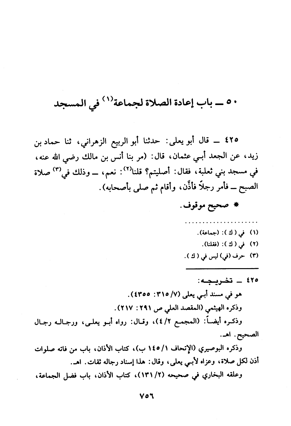 425 - قَالَ أَبُو يَعْلَى حَدَّثَنَا أَبُو الرَّبِيعِ الزَّهْرَانِيُّ ثنا حَمَّادُ بْنُ زَيْدٍ عَنِ الْجَعْدِ أَبِي عُثْمَانَ قَالَ (مَرَّ بِنَا أَنَسُ بْنُ مَالِكٍ رَضِيَ اللَّهُ عَنْهُ فِي مَسْجِدِ بَنِي ثَعْلَبَةَ فَقَالَ أَصَلَّيْتُمْ قُلْنَا نَعَمْ وَذَلِكَ فِي صَلَاةِ الصُّبْحِ §فَأَمَرَ رَجُلًا فَأَذَّنَ وَأَقَامَ ثُمَّ صَلَّى بِأَصْحَابِهِ