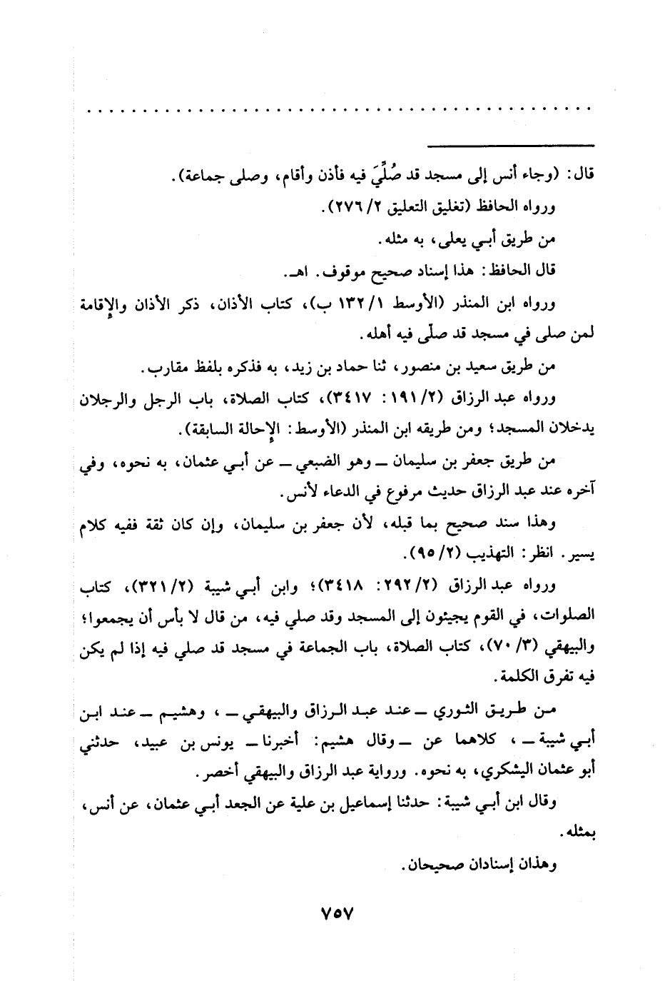 ورواه عبد الرزاق (2/ 191: 3417)، كتاب الصلاة، باب الرجل والرجلان يدخلان المسجد؛ ومن طريقه ابن المنذر (الأوسط: الإحالة السابقة).