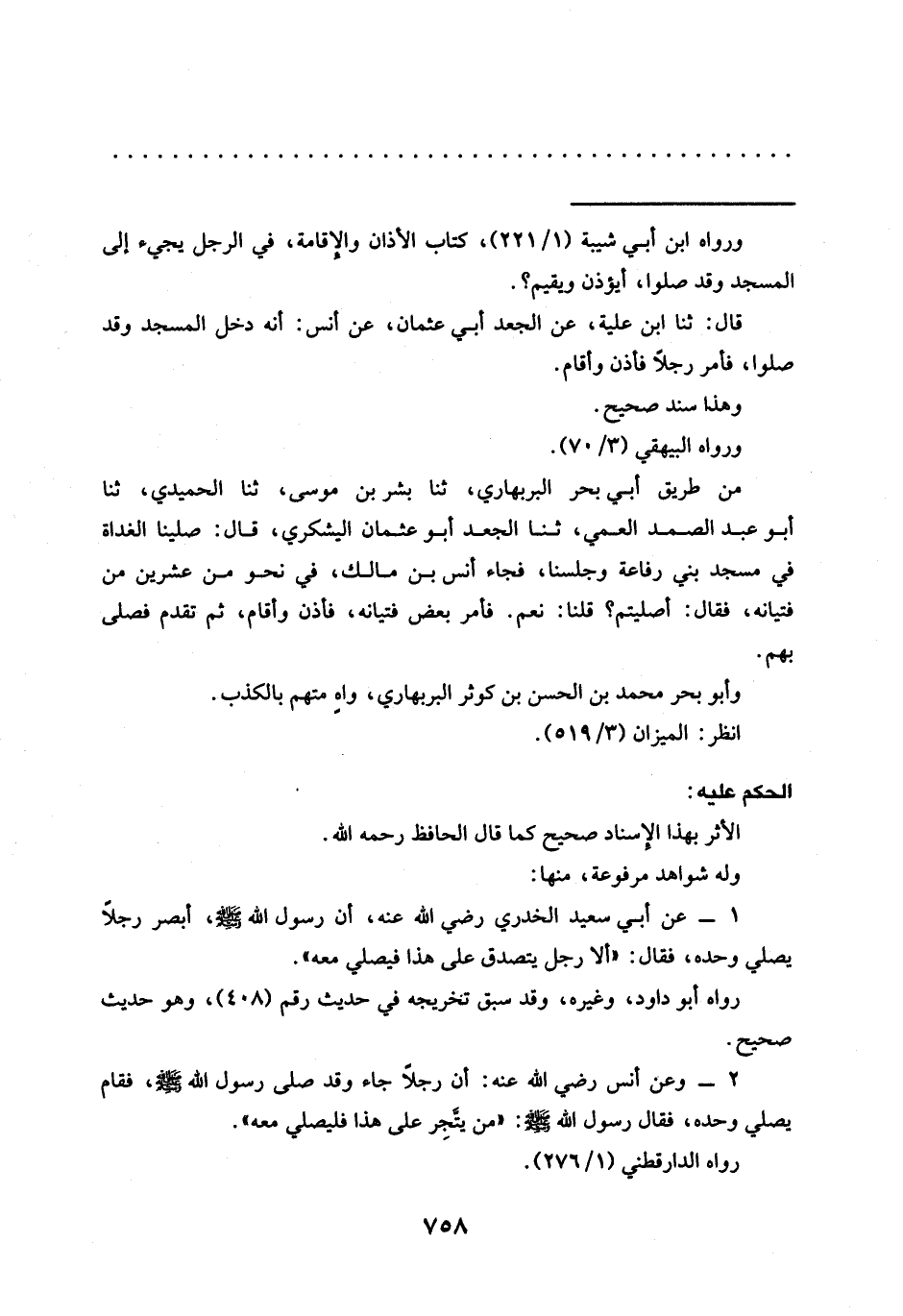 من طريق أبي بحر البربهاري، ثنا بشر بن موسى، ثنا الحميدي، ثنا أبو عبد الصمد العمي، ثنا الجعد أبو عثمان اليشكري، قال: صلينا الغداة في مسجد بني رفاعة وجلسنا، فجاء أنس بن مالك، في نحو من عشرين من فتيانه، فقال: أصليتم؛ قلنا: نعم. فأمر بعض فتيانه، فأذن وأقام، ثم تقدم فصلى بهم.